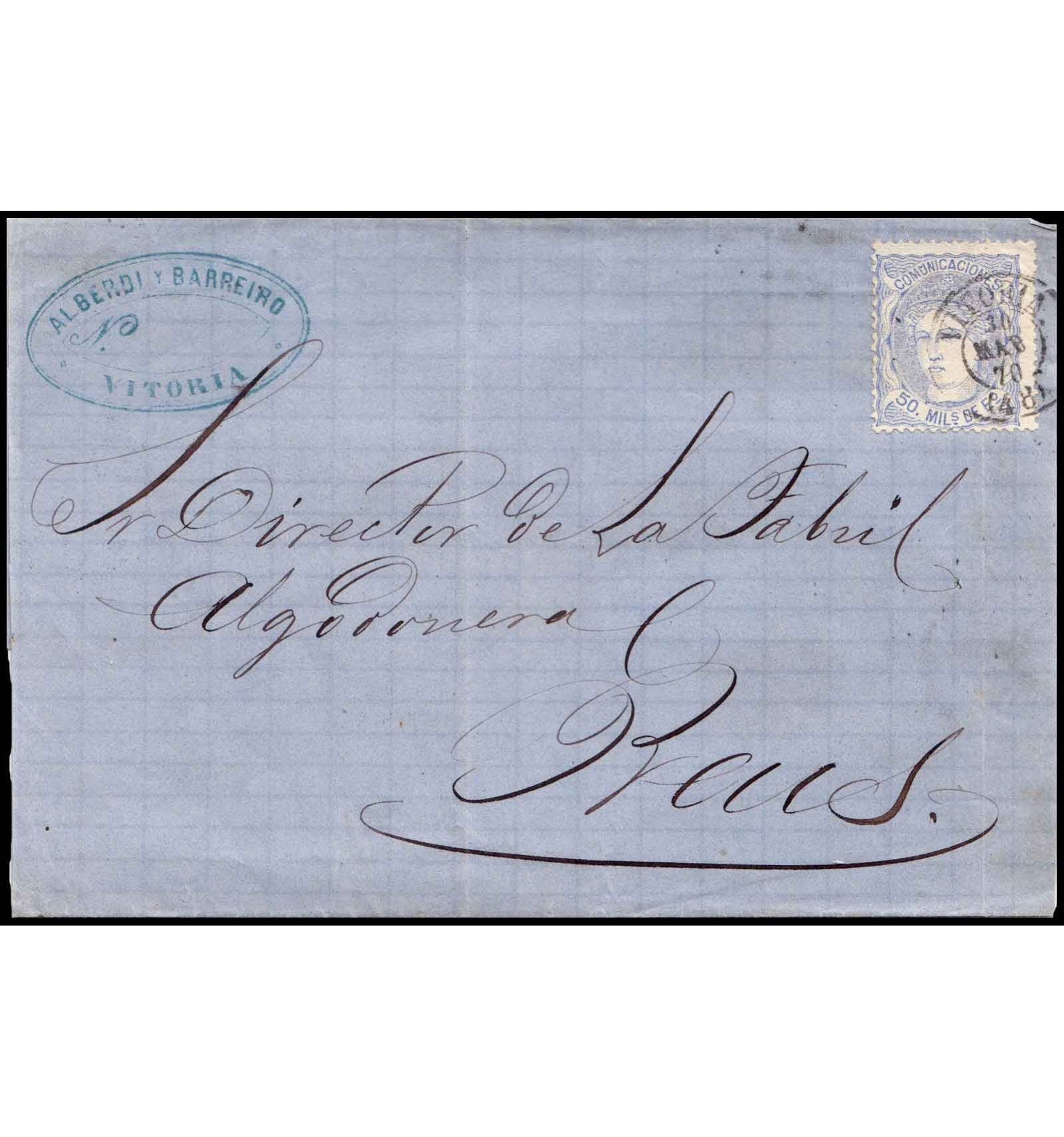 Envuelta de Vitoria (Alava) a Reus del 30 de marzo de 1870. En reverso tenue llegada a Reus.