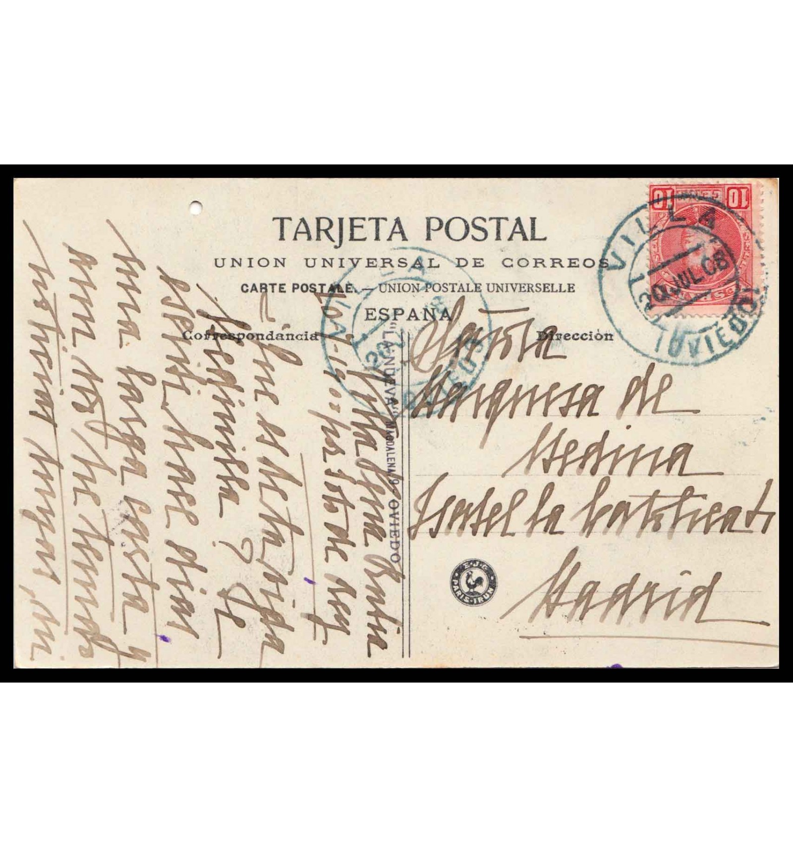 Tarjeta postal del camino de Quirós Peñas Juntas. Fechador tipo puente en color azul el 20 de julio de 1908.