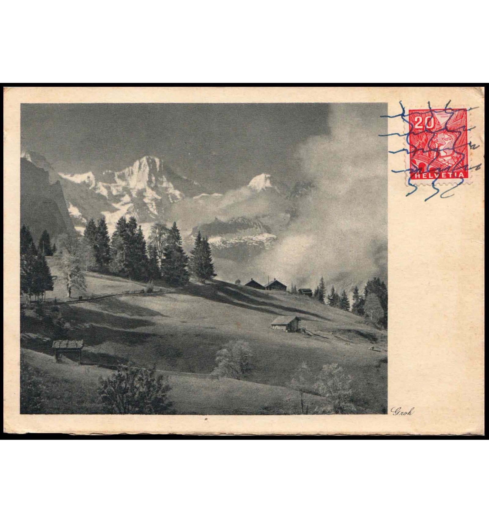 Tarjeta de Suiza a Oviedo (Asturias) del 14 de agosto de 1935. Tasada y en llegada marca del Registro de Entrada de Oviedo del 17 de julio.