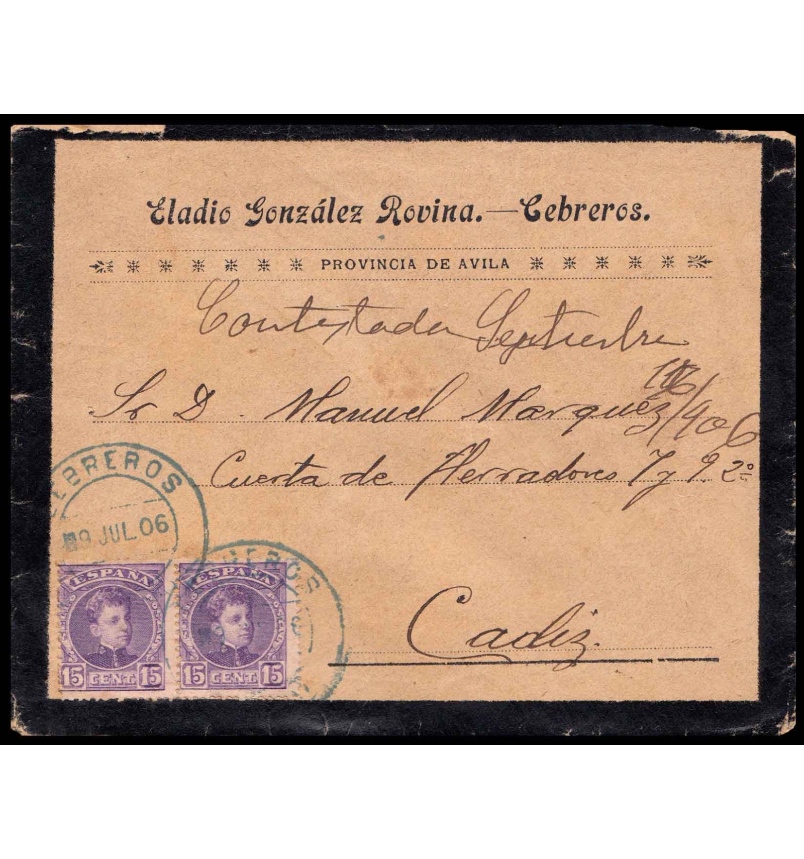 Sobre de luto de Cebreros (Ávila) a Cádiz del 9 de julio de 1906. Fechador en color azul. Doble porte nacional de 30 cts. En reverso llegada a Cádiz.