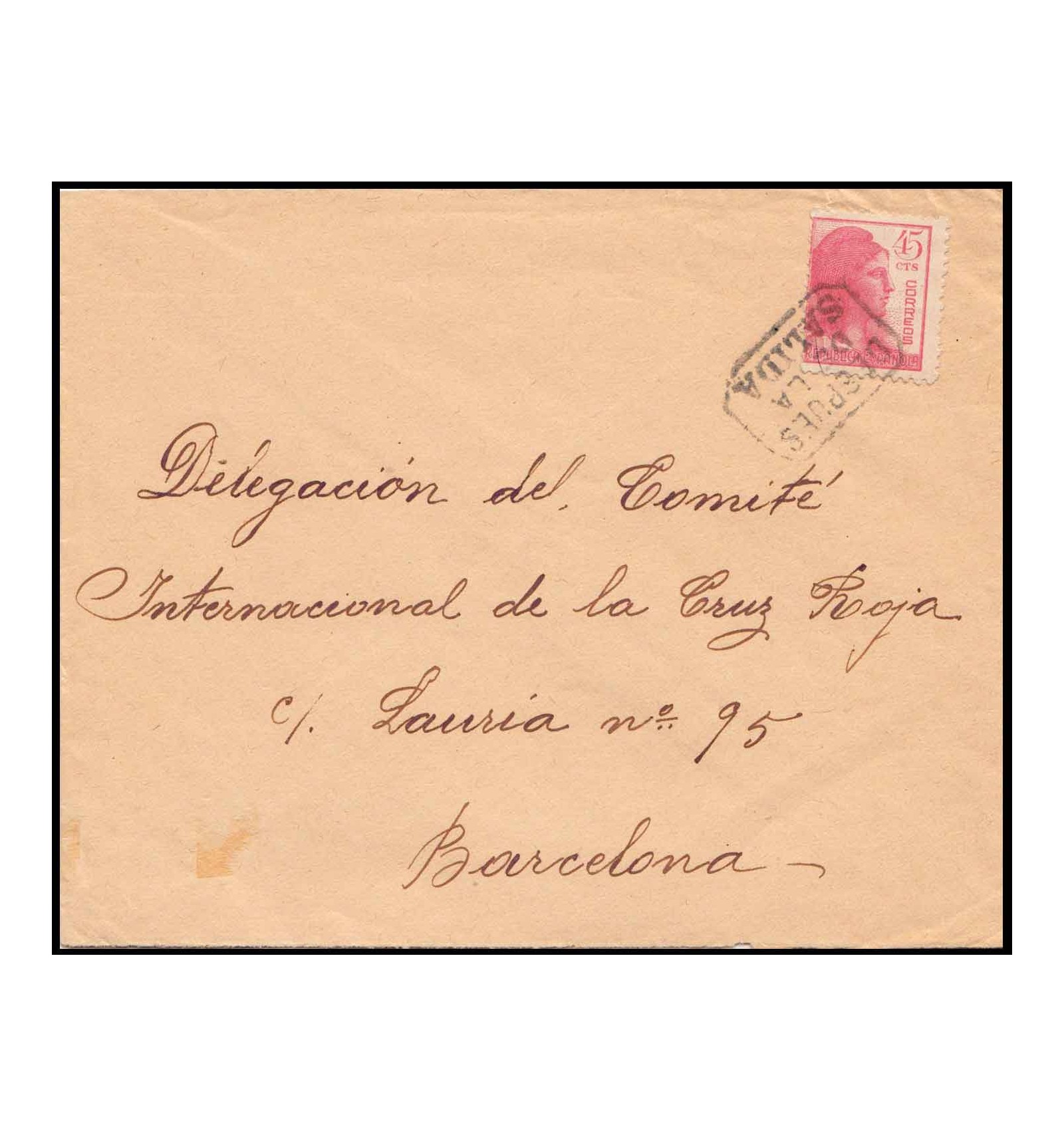 Sobre de Risco (Badajoz, según remitente) a Barcelona. Matasello de anulación del sello DESPUES DE LA SALIDA. Es posible incluso que el matasello haya sido puesto en sellada, ya que la población de Risco era muy pequeña.