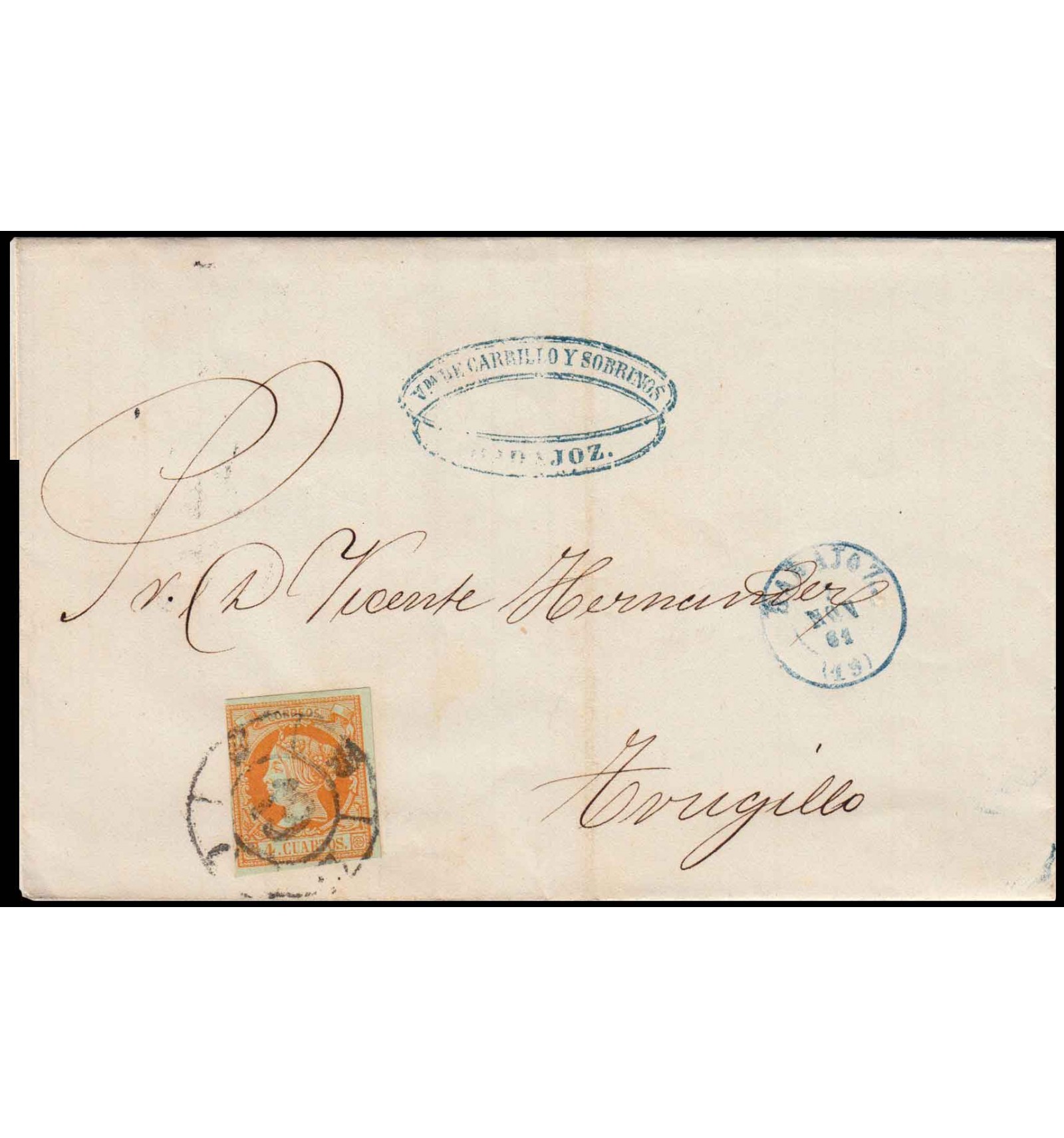 Envuelta de Badajoz a Trujillo del 1 de noviembre de 1861. Rueda de carreta 19 de Badajoz y fechador azul de Badajoz. En reverso llegada a Trujillo del día 2.