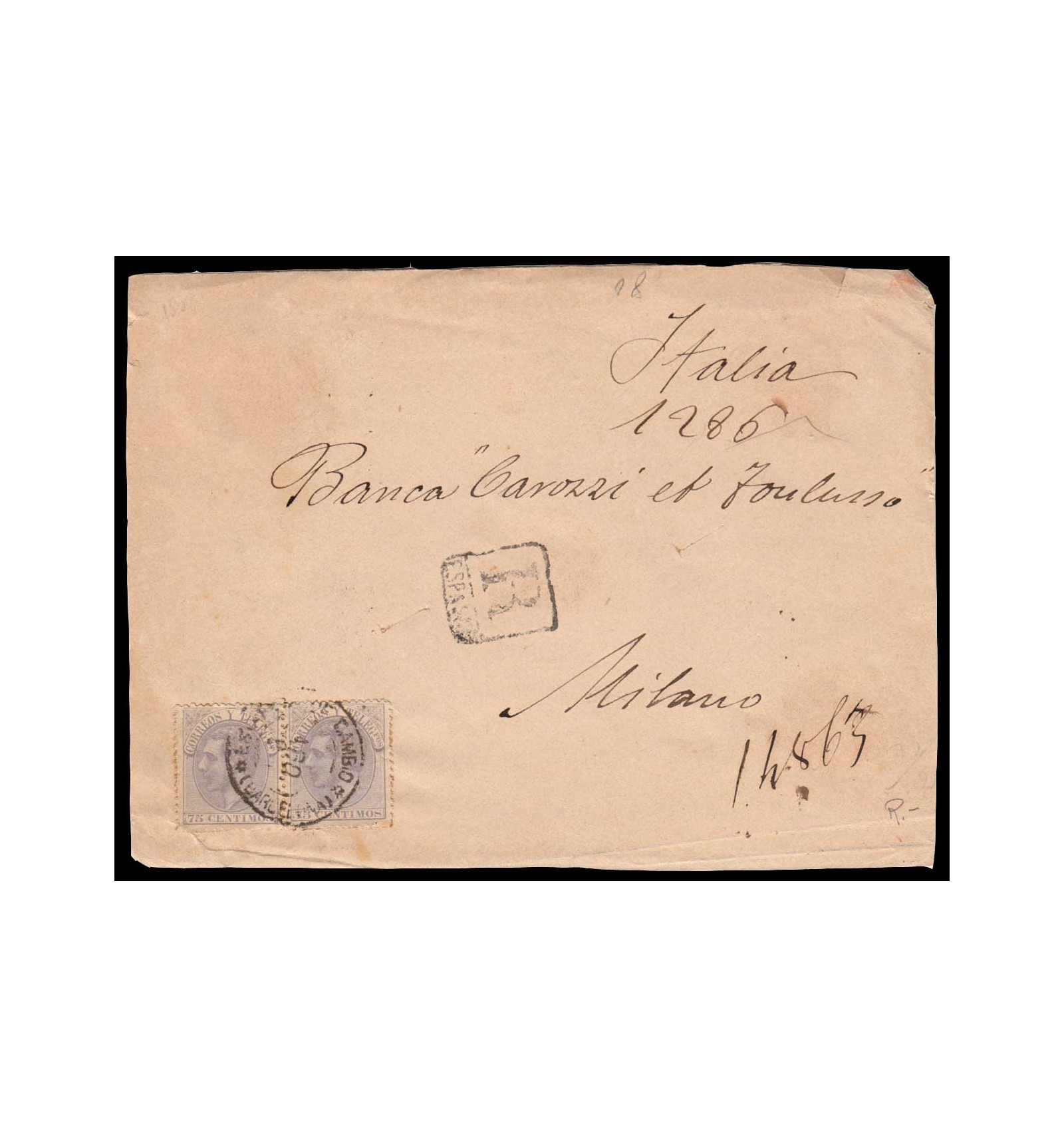 Frontal (posiblemente de sobre o paquete de pequeño formato) de certificado de Barcelona a Italia de agosto de hacia 1882. En el fe hedor el mes y el año están girados. Raro franqueo correspondiente a 5 portes (25 cts por cada 15 gramos y 25 cts por sobrepone de certificado) y completado con dos sellos de 75 cts.