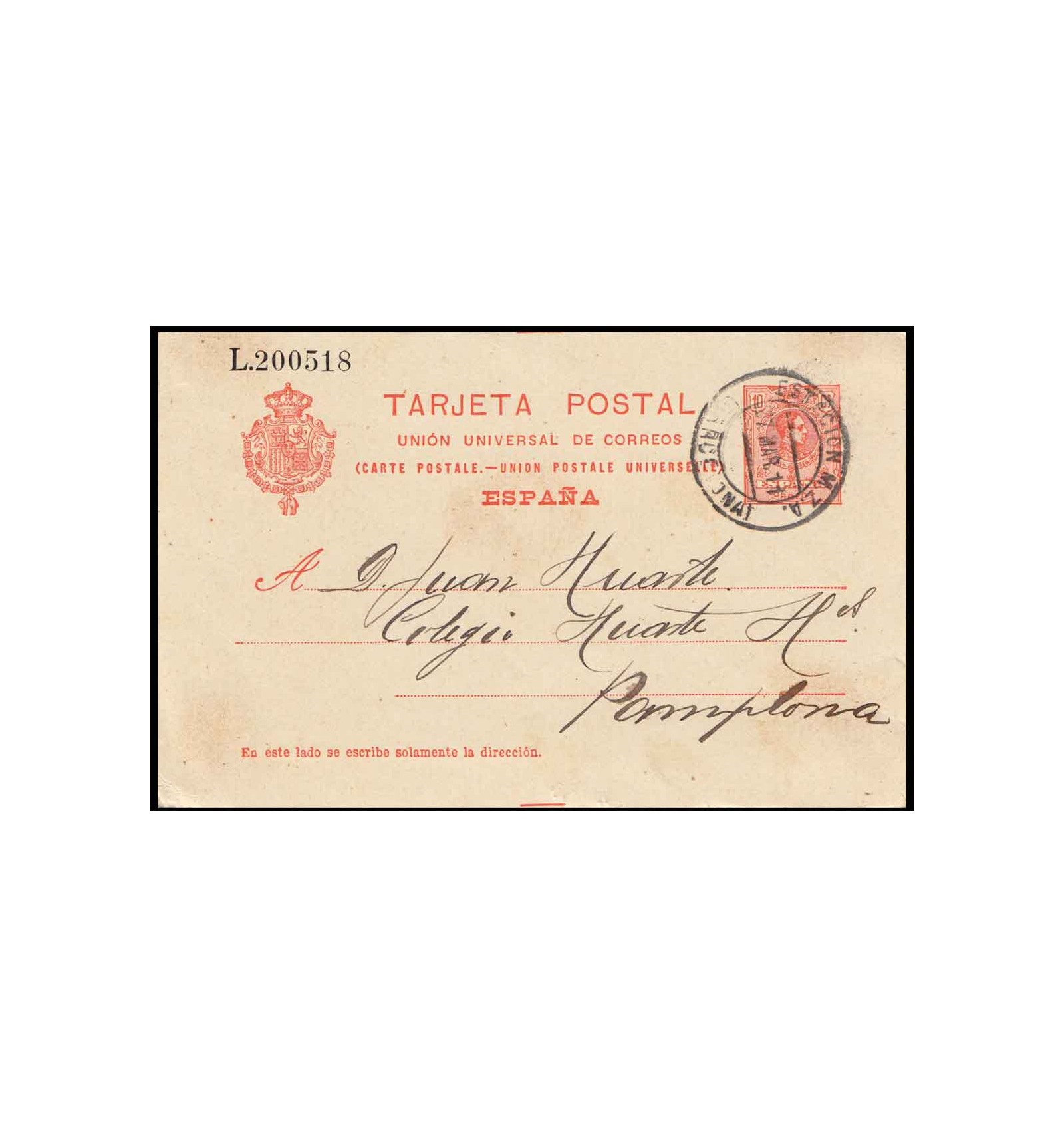 Entero postal de Barcelona a Pamplona del 7 de marzo de 1911. Matasello estación ferrocarril.