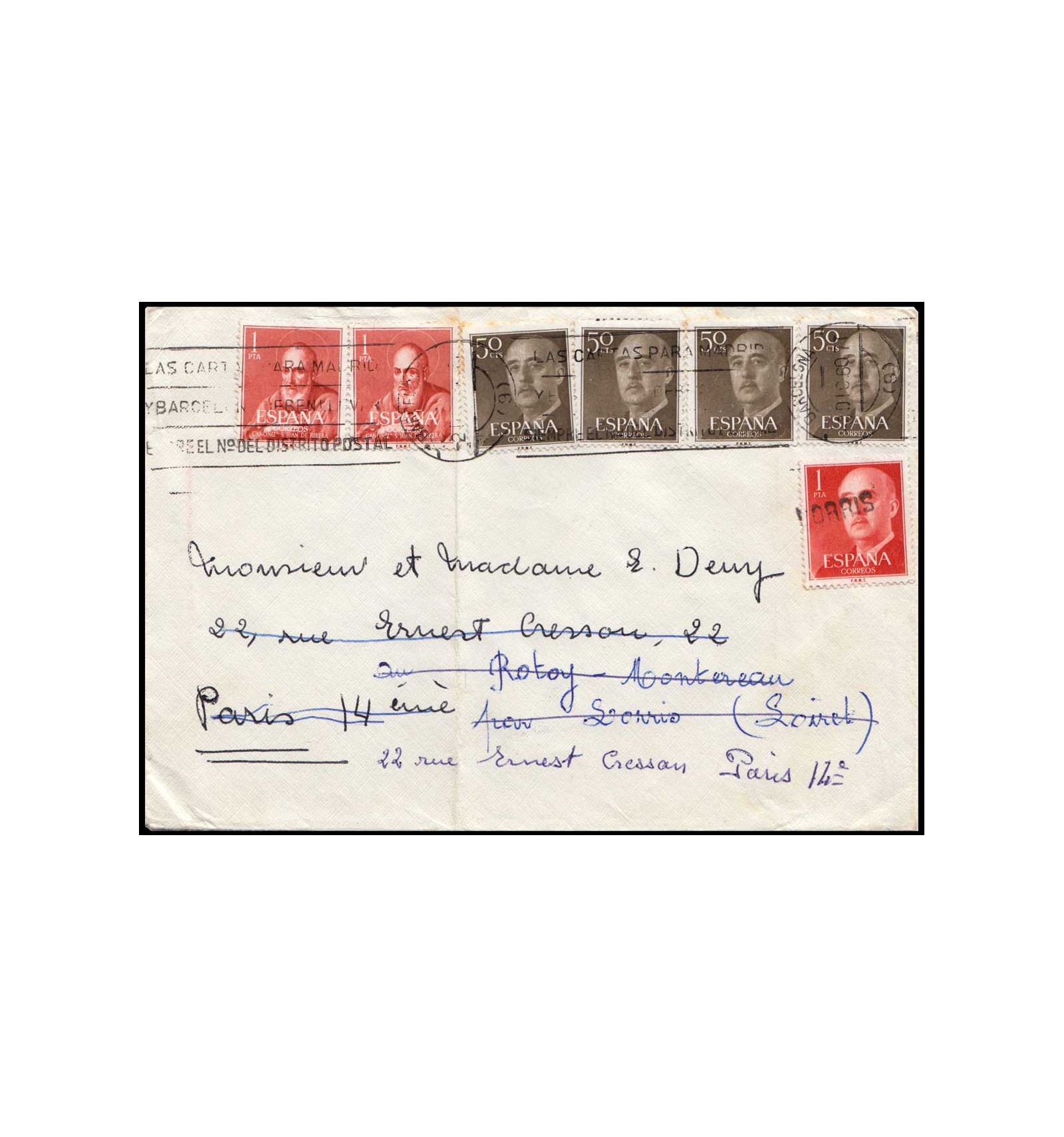 Sobre de Barcelona a Francia y reexpedida en destino y uno de los sellos que quedó sin matasellar en salida se mataselló en el primer destino francés con el lineal francés Lorris. Salida de diciembre de 1960 y en reverso llegada y tránsitos franceses.