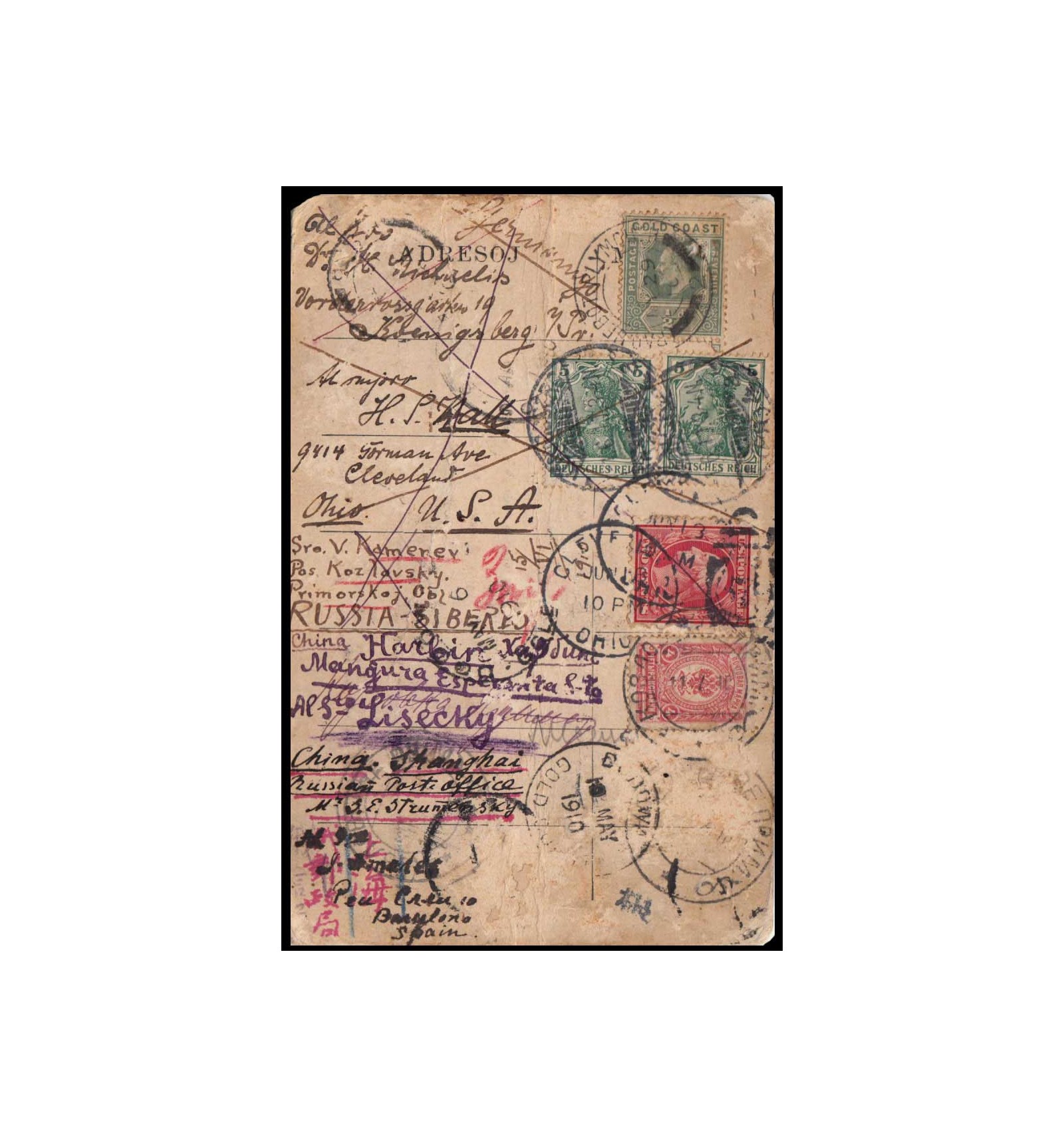Tarjeta esperantista enviada por Joan Amades nacida en Barcelona el 4 de abril de 1910. Transitó durante más de tres meses por Costa de Oro, Alemania, EE.UU, Rusia, China (Harbin y Shanghai) y Japón. Además de los destinos de tránsito, que en este caso algunos no son frecuentes y que pasó por Europa, Africa y Asia), el franqueo español combina sellos de Alfonso XII y XIII (dos emisiones).