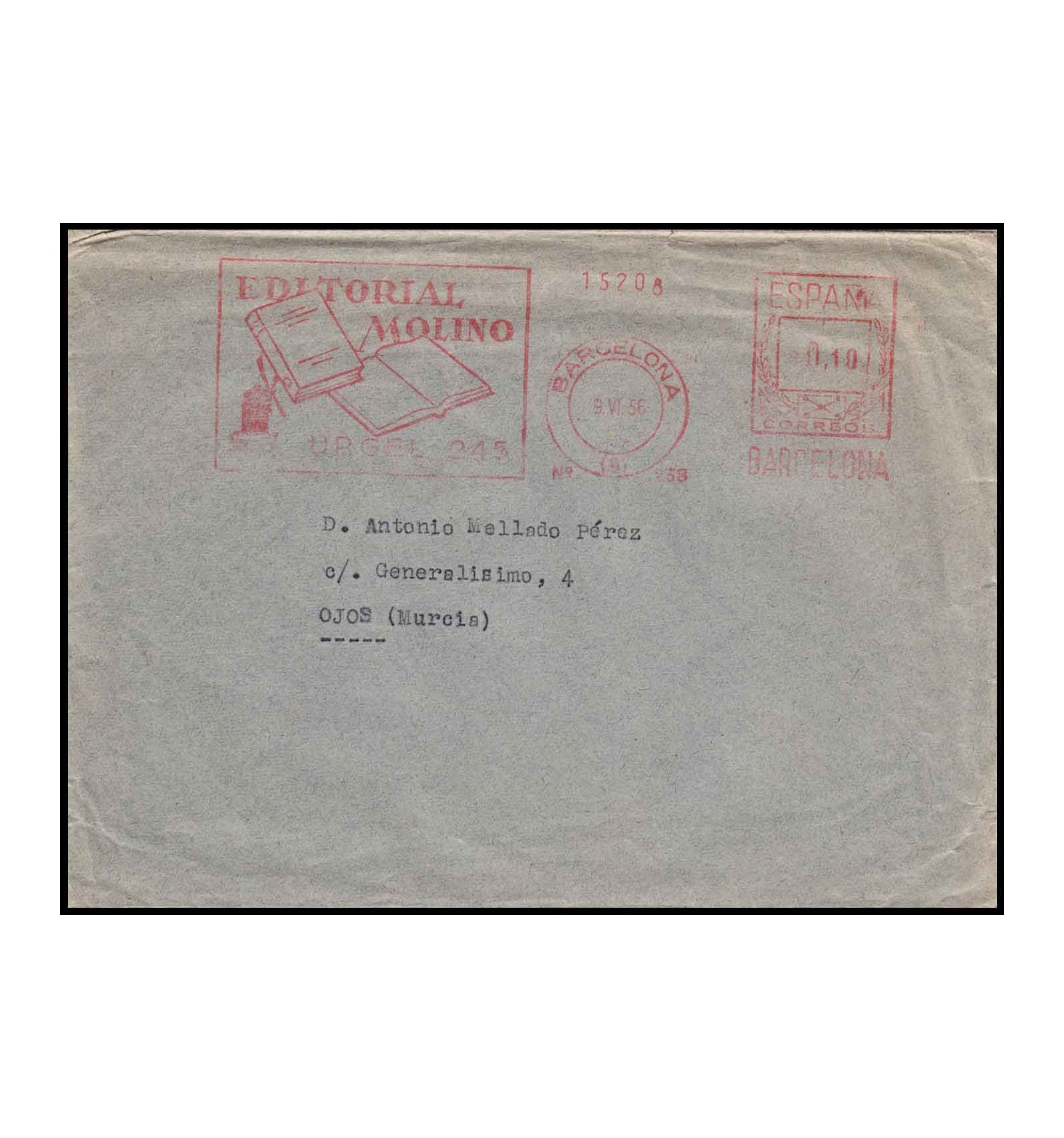 Sobre de Barcelona a Murcia del 9 de junio de 1956. Franqueo mecánico 238 de la Editorial Molino.