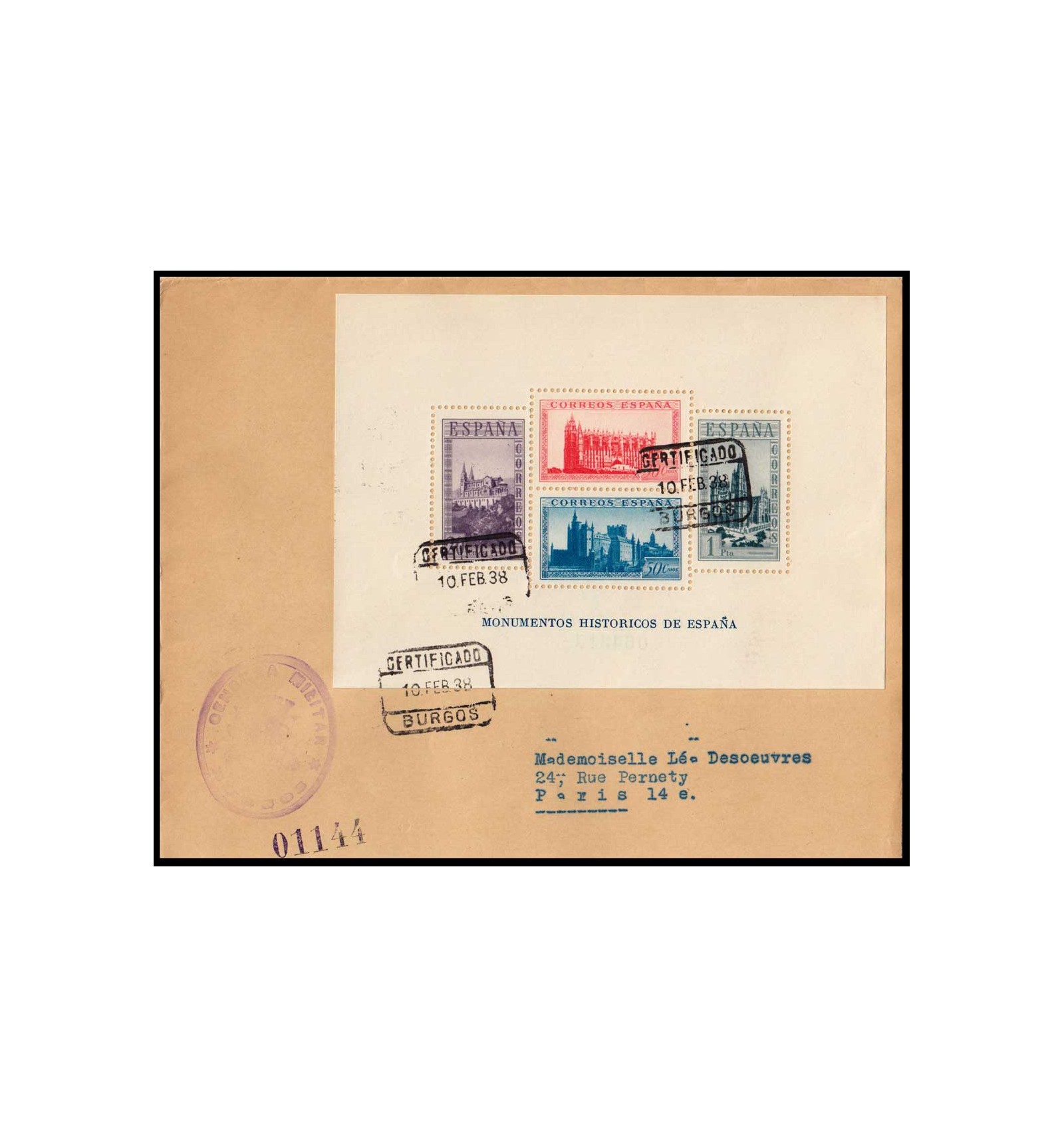 Sobre de Burgos a París circulada realmente pero con fines filatélicos. Primer día de circulación s. En el interior se acompaña documento que se enviaba indicando el primer día. En reverso tránsito de certificado por Irún y llegada a Francia.