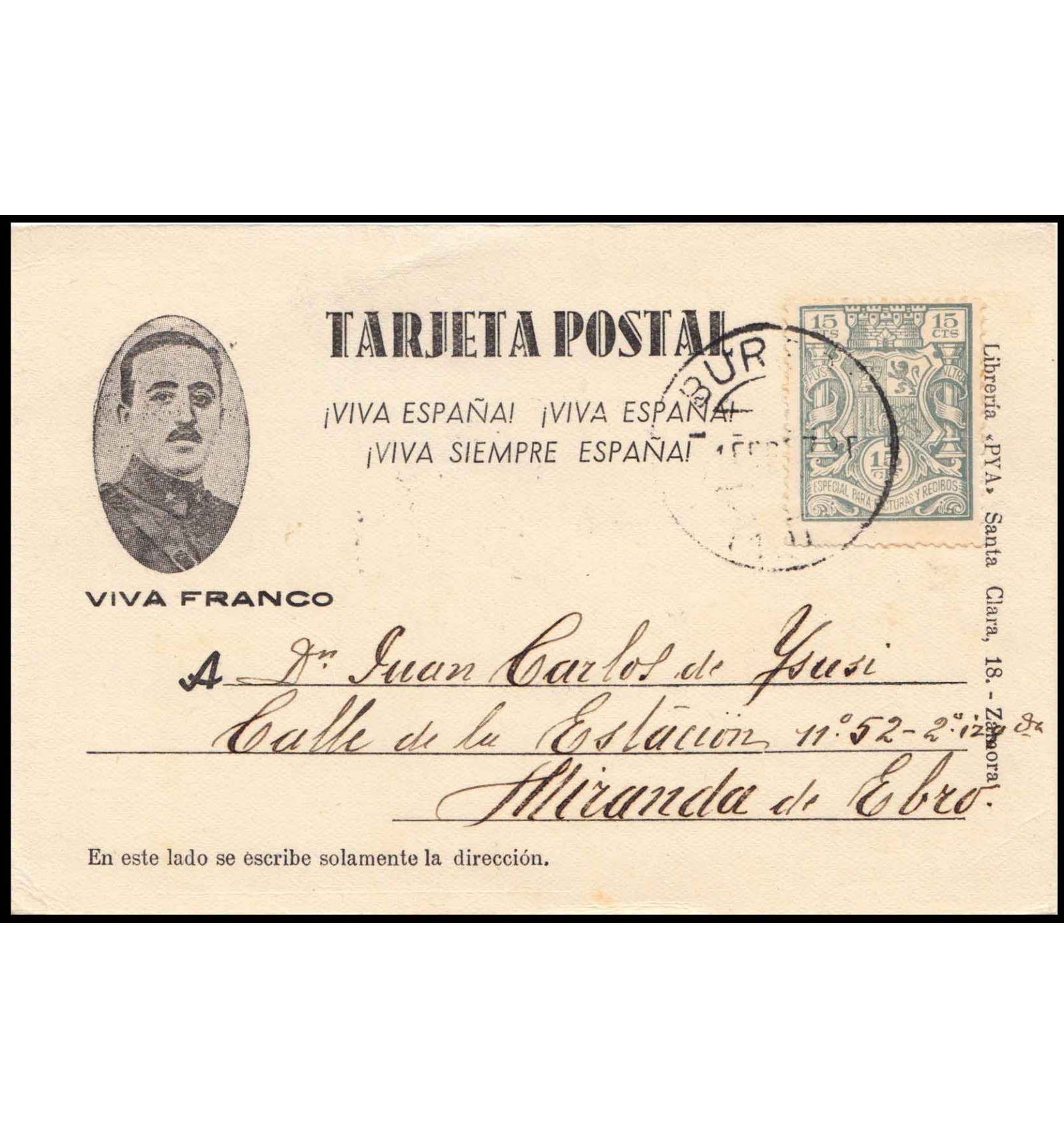 Tarjeta postal patriótica de Burgos a Miranda de Ebro del 1 de febrero de 1937. Sello fiscal de Especial para facturas y recibos usado como postal.