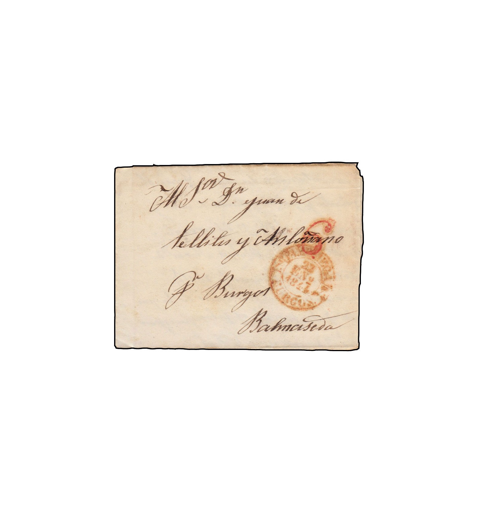Carta de Pampliega (Burgos) a Valmaseda del 22 de enero de 1844. Fechador baeza y porteo 6 en rojo.