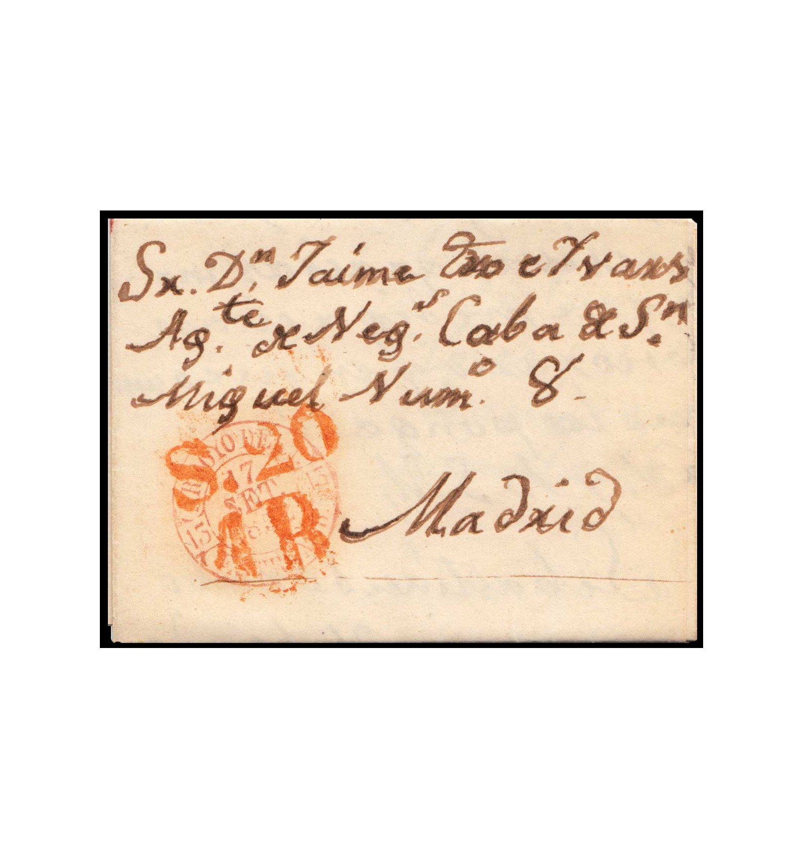 Carta de Arroyo del Puerco (hoy en día Arroyo de la Luz, Cáceres) a Madrid del 17 de septiembre de 1842 con baeza rojo. Fechador porteo de llegada de Madrid y porte 1R rojo.