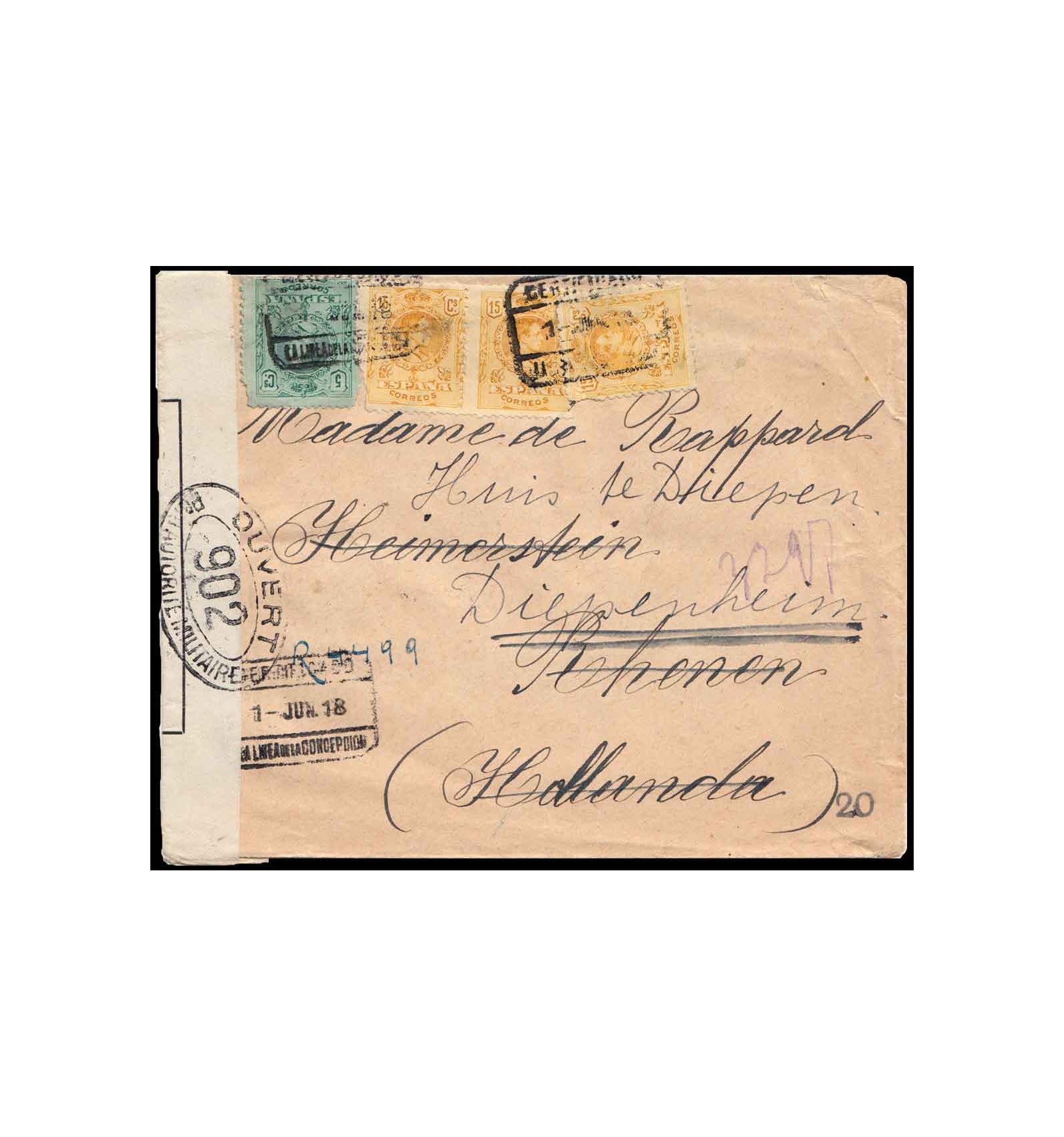 Sobre certificado de La Línea de la Concepción (Cádiz) a Holanda del 1 de junio de 1918 y reexpedido internamente en Holanda. En reverso fechador de llegada a ambas localidades holandesas.