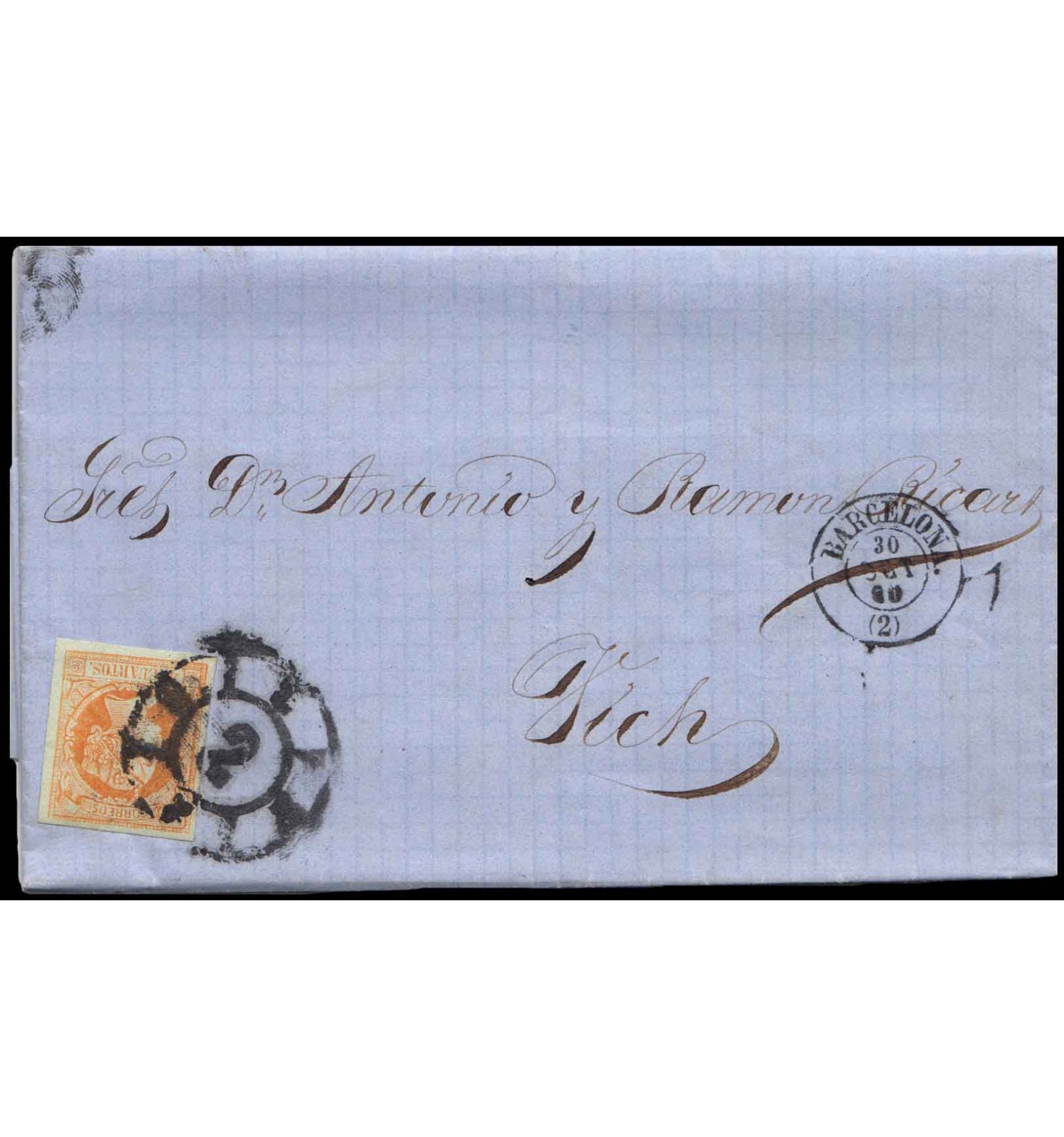 Carta de Barcelona a Vich del 23 de octubre de 1860. Matasello rueda de carreta 2. En reverso llegada a Vich.