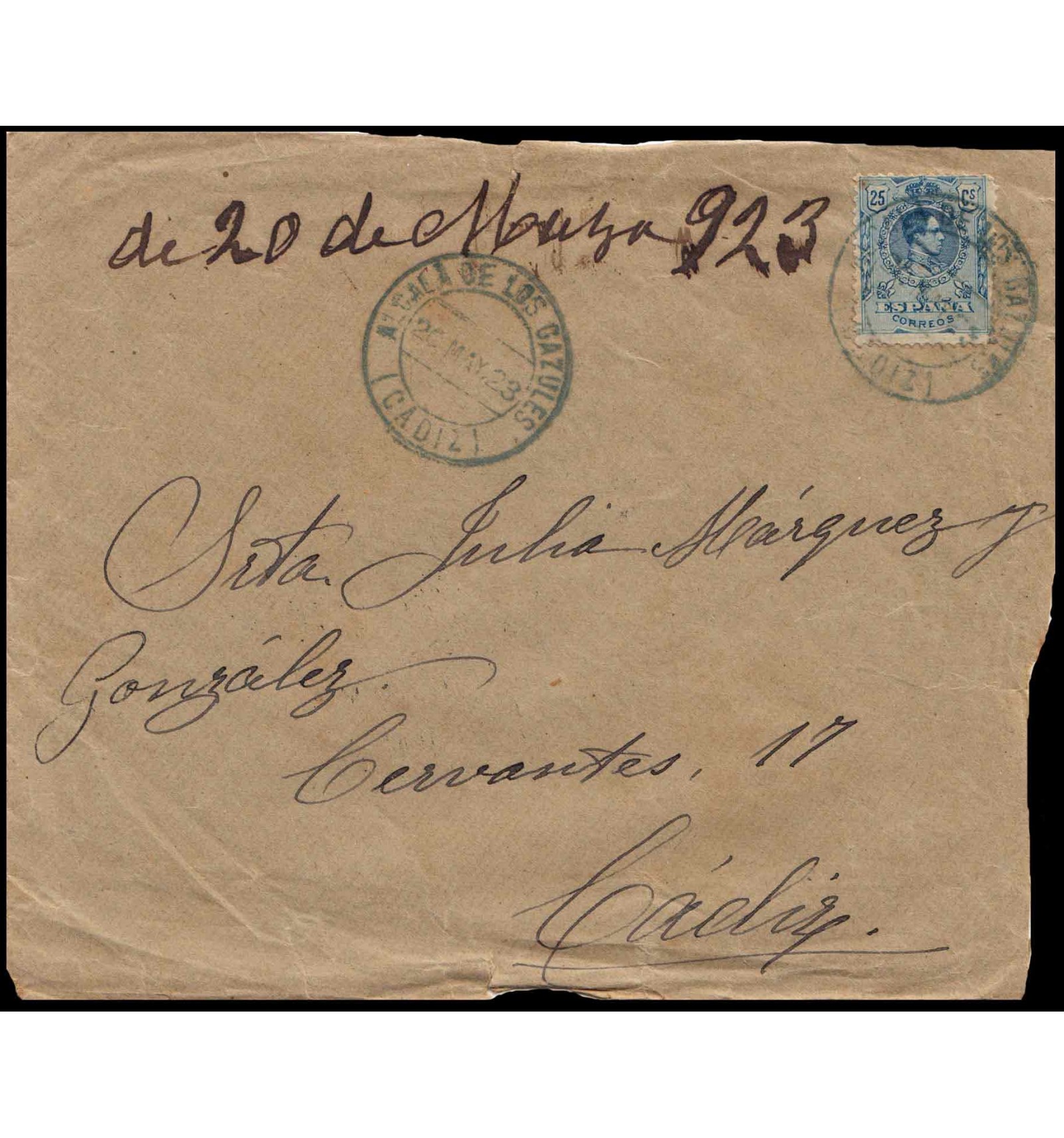 Sobre de Alcalá de los Cazules (Cádiz) a Cádiz del 20 de mayo de 1923. Fechador en color azul. En reverso llegada a Cádiz.