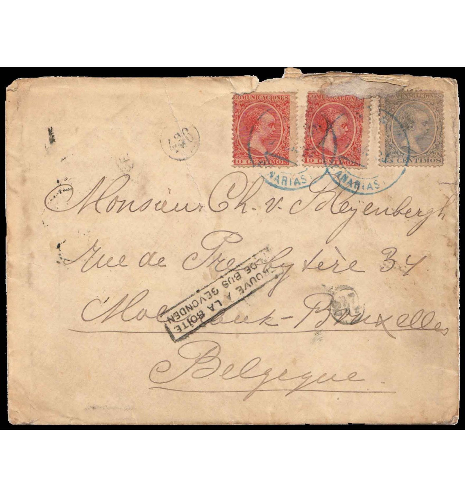 Sobre Las Palmas (Canarias) a Bruselas (Bélgica). Matasello fechador azul de Las Palmas. Tampón recuadrado TROUVE A LA BOITE (encontrada en buzón). En reverso fechador de llegada y pequeño papel del correo belga para cerrar un desperfecto de tránsito; fallos en sobres relacionados con desperfectos de la pérdida de la carta.