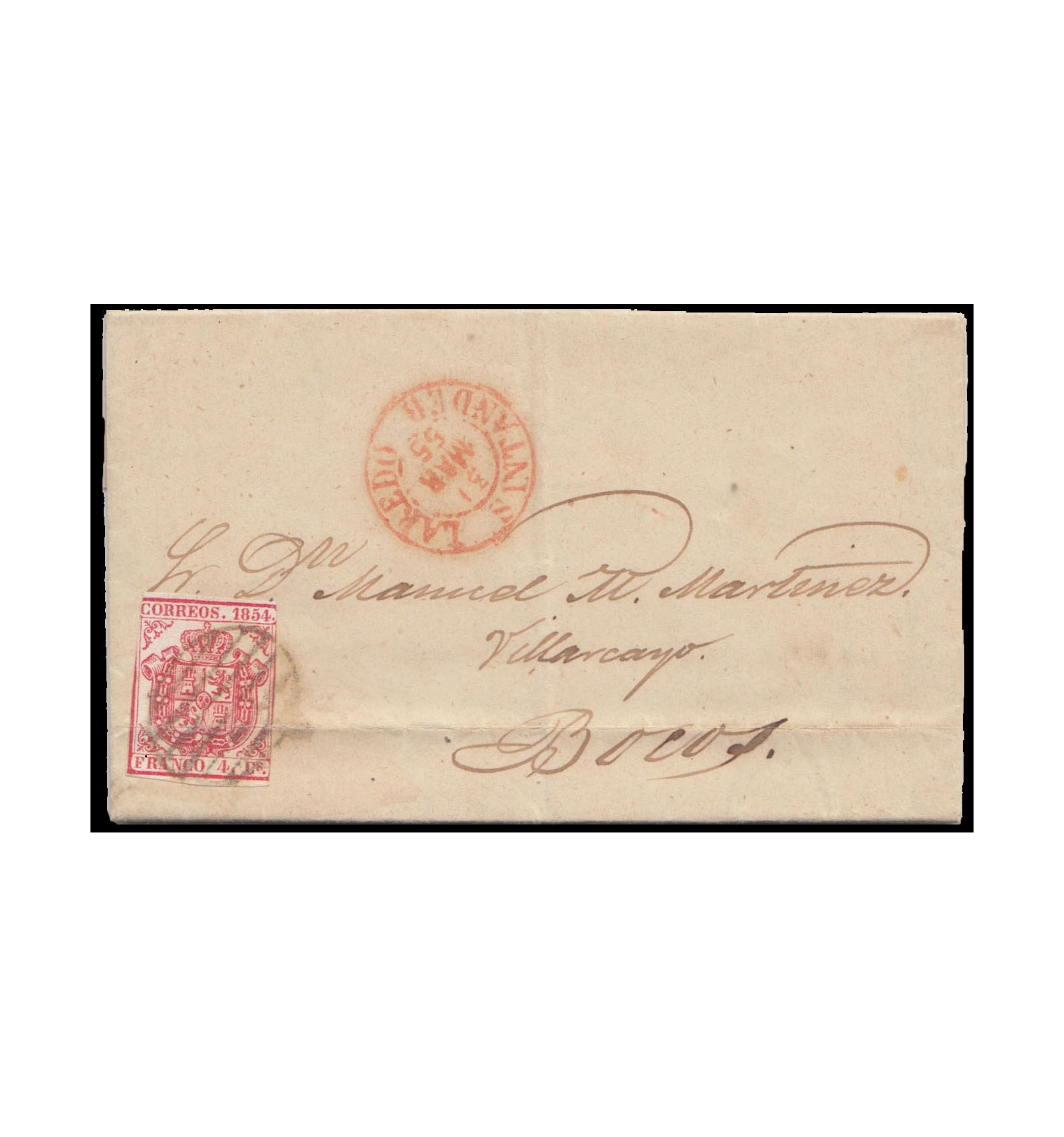 Carta de Laredo (Santander, Cantabria) a Bocos (Burgos) del 31 de diciembre de 1855. Sello matasellado con parrilla negra y fechador rojo de salida. Ultimo día de circulación de la serie.