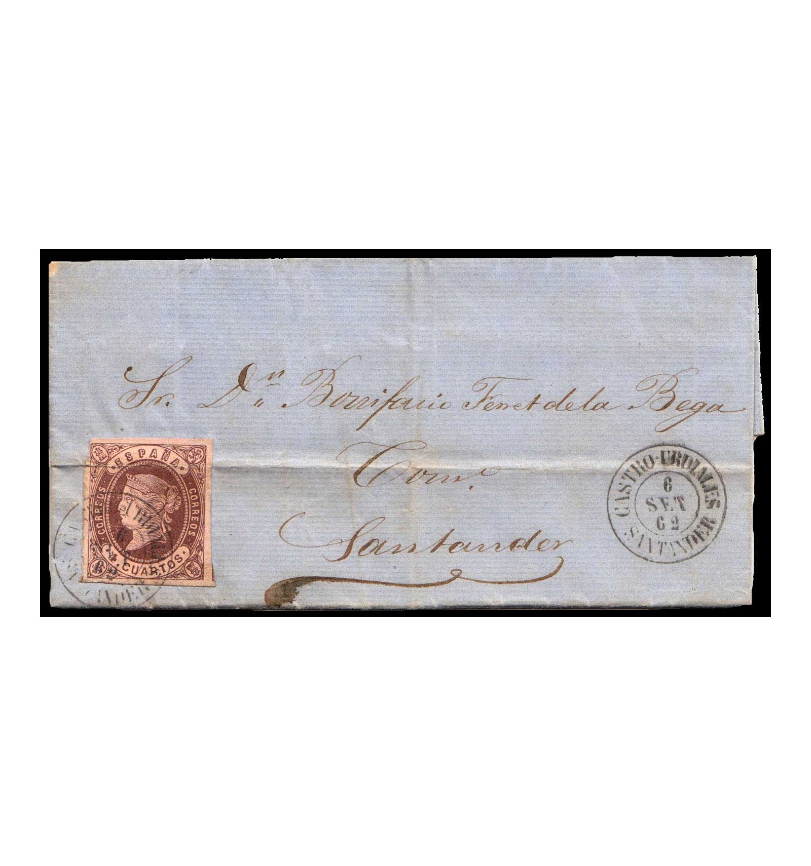 Carta de Castro Urdiales (Santander, Cantabria) a Santander del 6 de septiembre de 1862. Matasello fechador negro. En reverso fechador de llegada en negro de Santander del día 7.