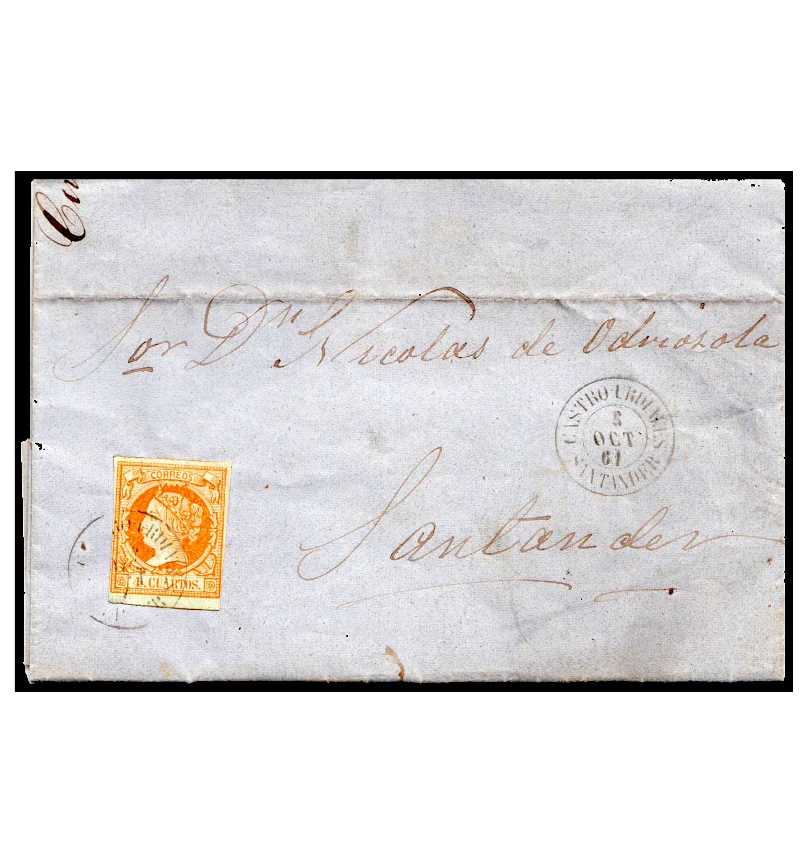 Carta de Castro Urdiales (Santander, Cantabria) a Santander del 5 de octubre de 1861. Matasello fechador negro. En reverso fechador de llegada en negro de Santander.