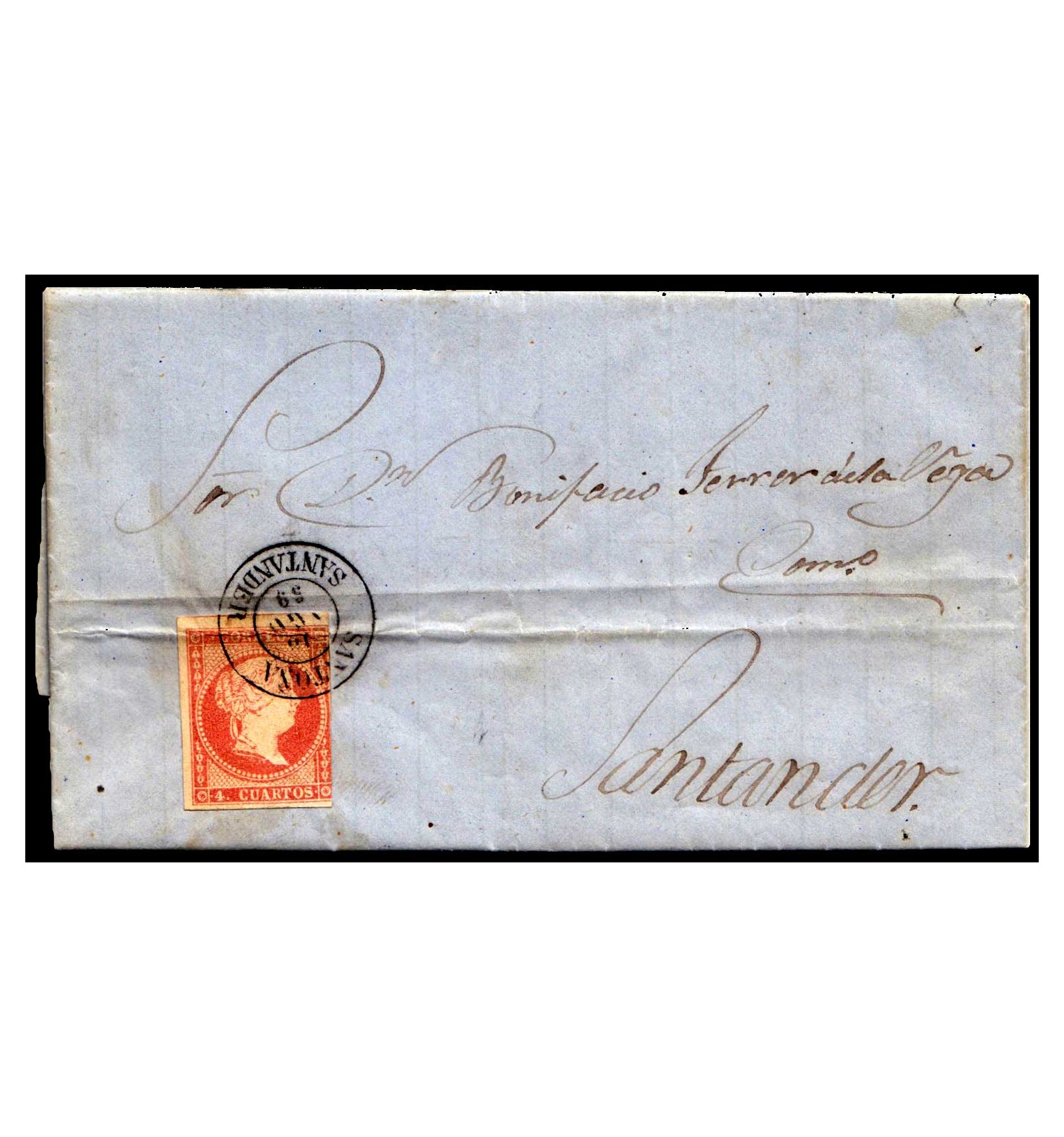 Carta de Santoña (Santander, Cantabria) a Santander del 18 de agosto de 1859. Matasello fechador negro de Santoña. En reverso fechadores negros de Ramales de la Victoria (del día 18) y de Santander (como llegada del día 19.