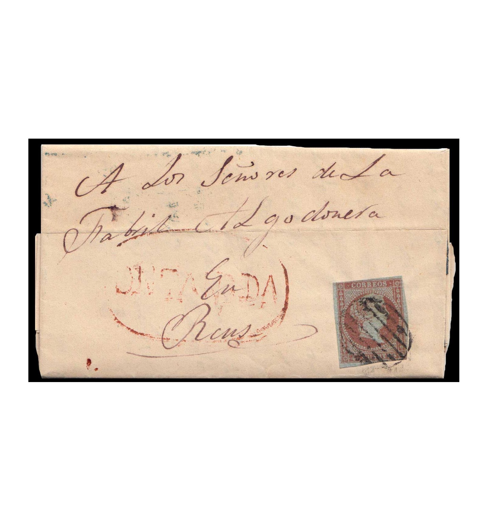 Carta nacida en Labiga (¿?) a Reus el 19 de junio de 1855. Sello matasellado con parrilla negra y en anverso matasello prefilatélico rojo de ONTANEDA. EN reverso llegada a Reus en fechador azul del 26 de junio.
