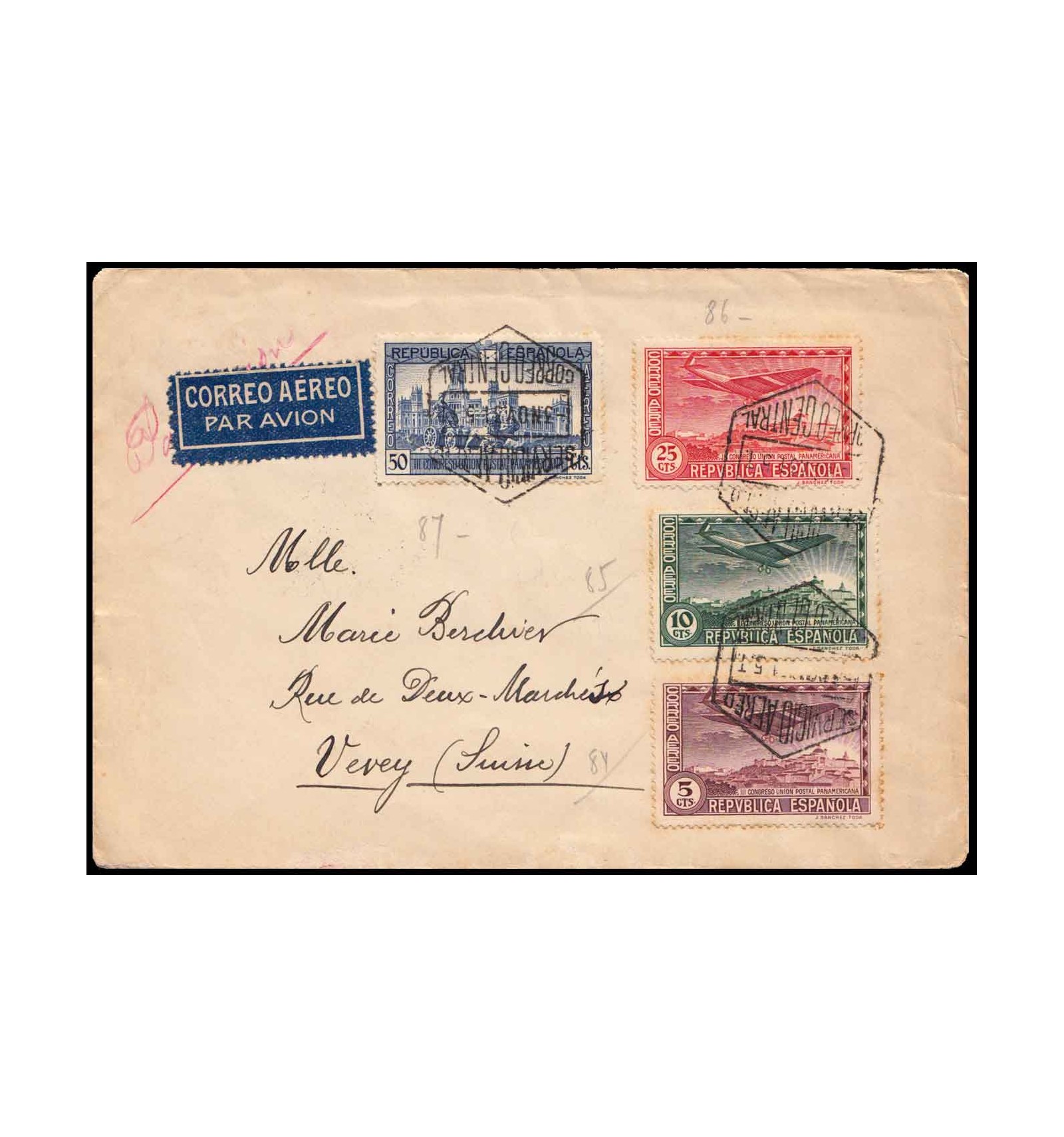 Sobre de Madrid a Suiza fechada el 3 de noviembre de 1935. En reverso fechador de tránsito de París. Matasello del Servicio Aéreo Correo Central. Muy posiblemente la carta no circuló por correo aéreo, ya que el franqueo debería haber sido de 1 ptas.