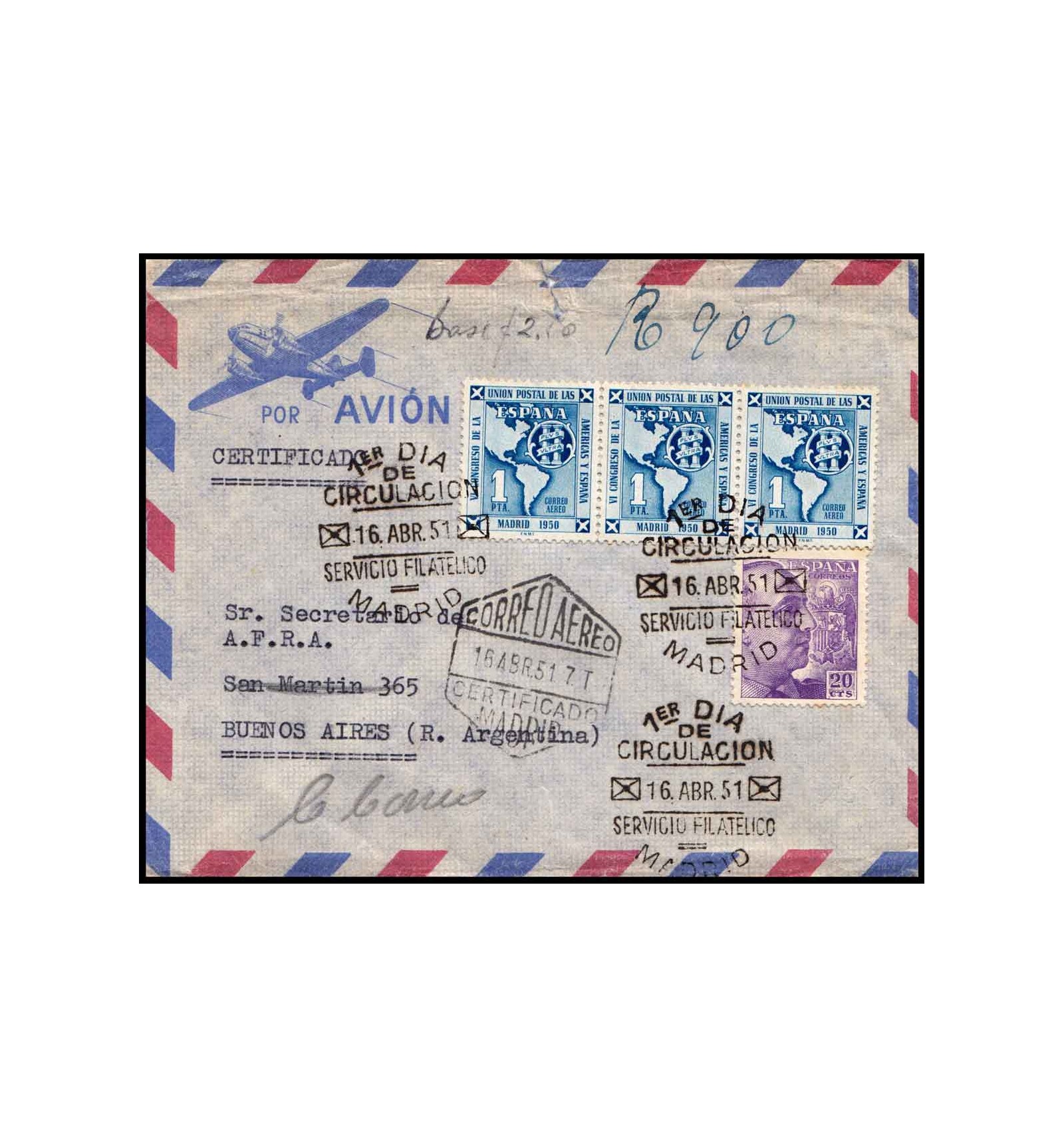 Sobre certificado de Madrid a Argentina del 16 de abril de 1951 fechado el 16 de abril de 1951, primer día de circulación del sello 1091. Matasello del servicio filatélico.