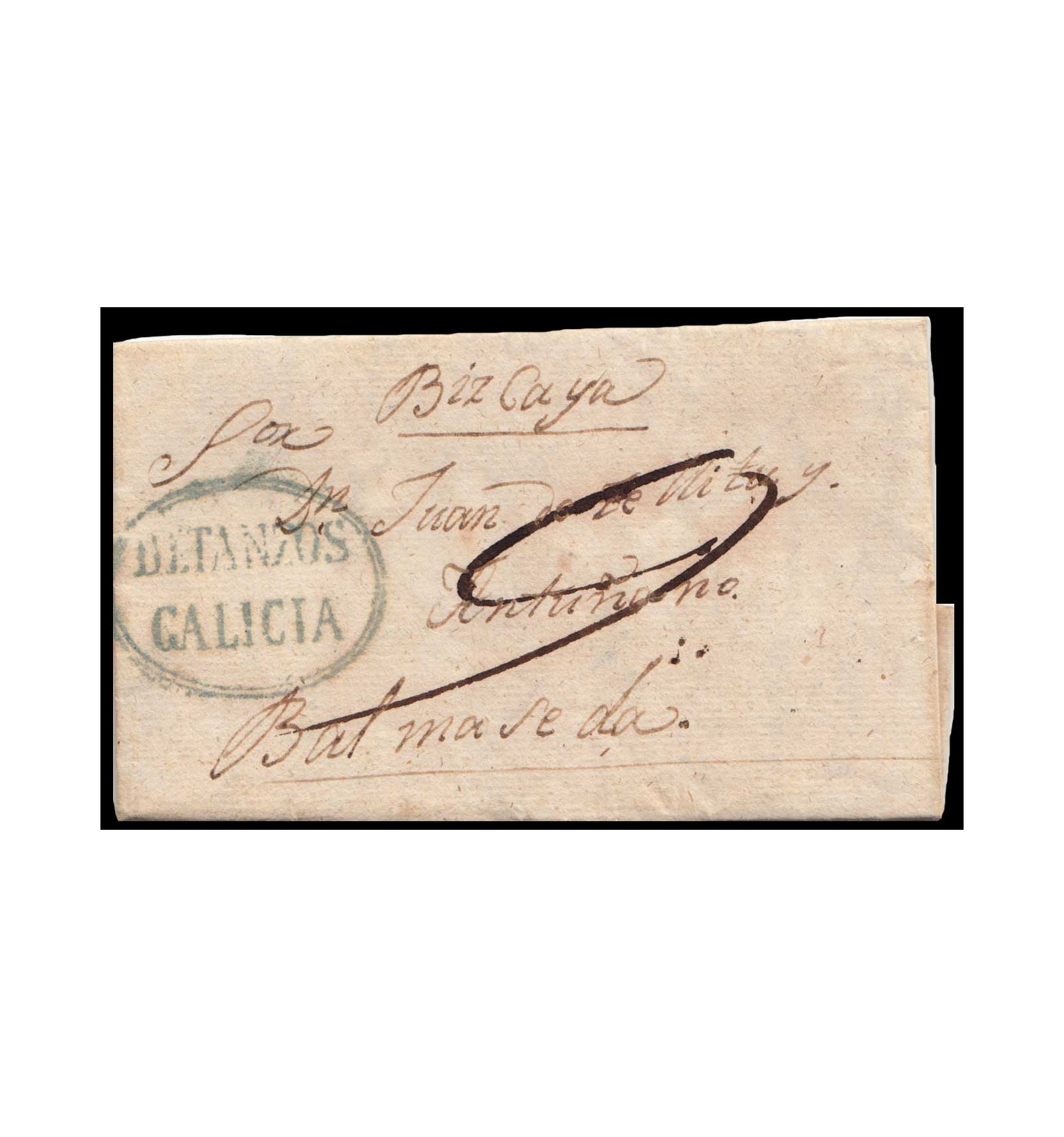 Carta de Betanzos (Galicia) a Valmaseda (Vizcaya) del 10 de julio de 1832. Marca recreada en azul-verdoso BETANZOS GALICIA. Porteo manuscrito 9.