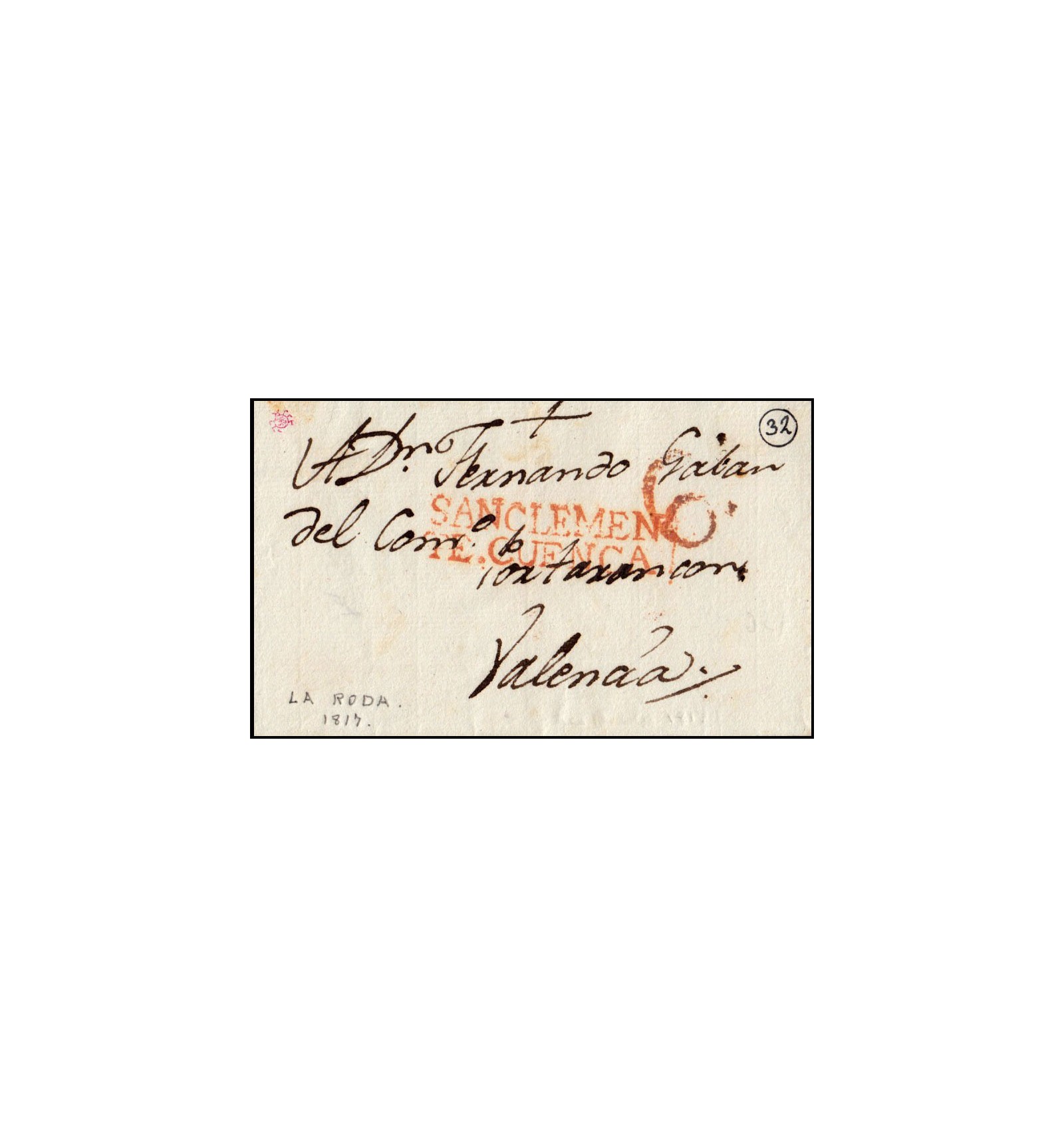 Frontal de San Clemente (Cuenca) a Valencia. Porteo 6 ladrillo. Marca prefilatélica ladrillo. El porteo es anterior a la impresión de la marca prefilatélica.