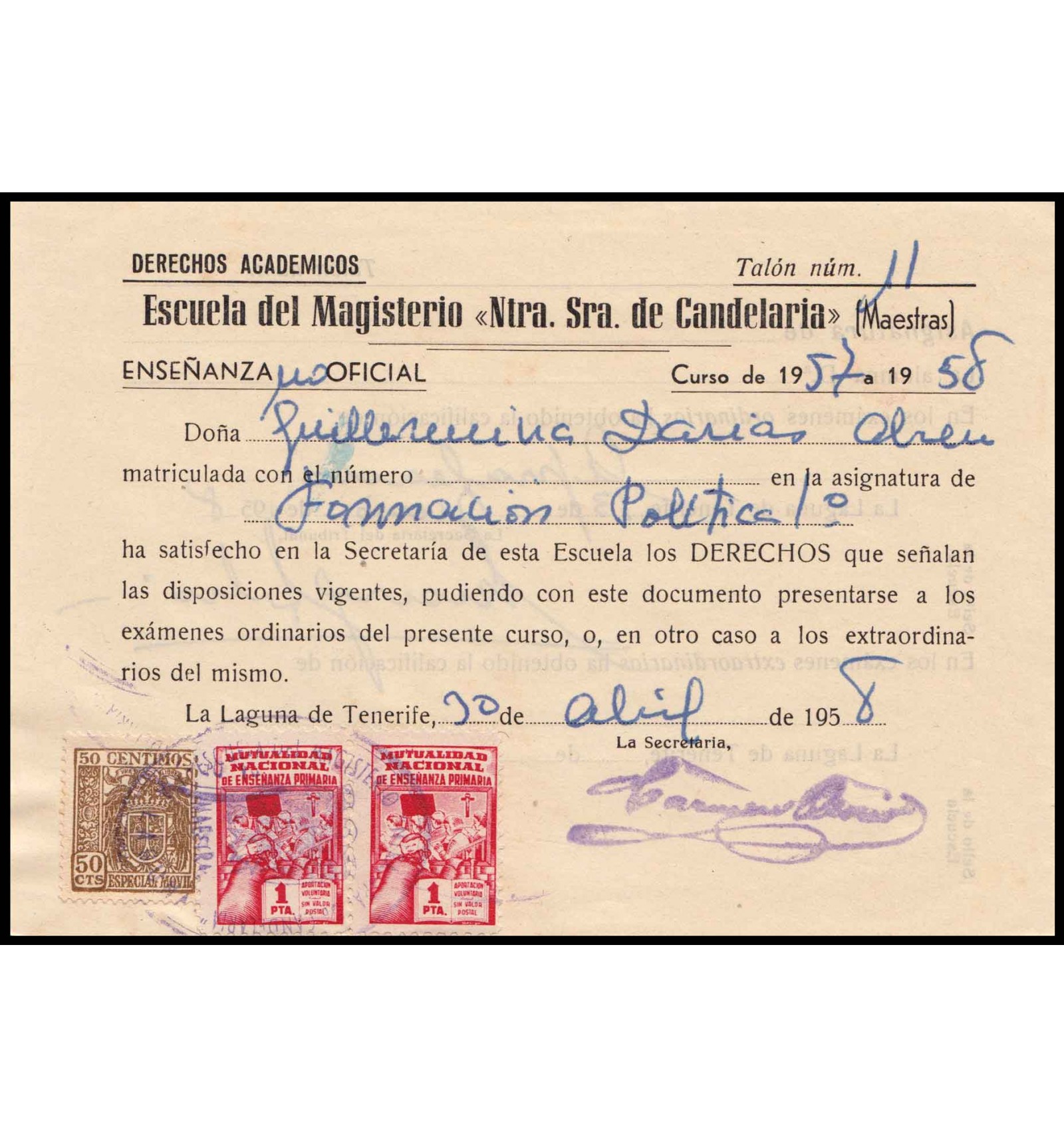 Documento de derechos académicos para presentarse a examen de Formación Política en la Laguna de Tenerife (Canarias) del 30 de abril de 1960. Fiscal y viñeta fiscal de la Mutualidad Nacional de Enseñanza Primaria de 1 pta.