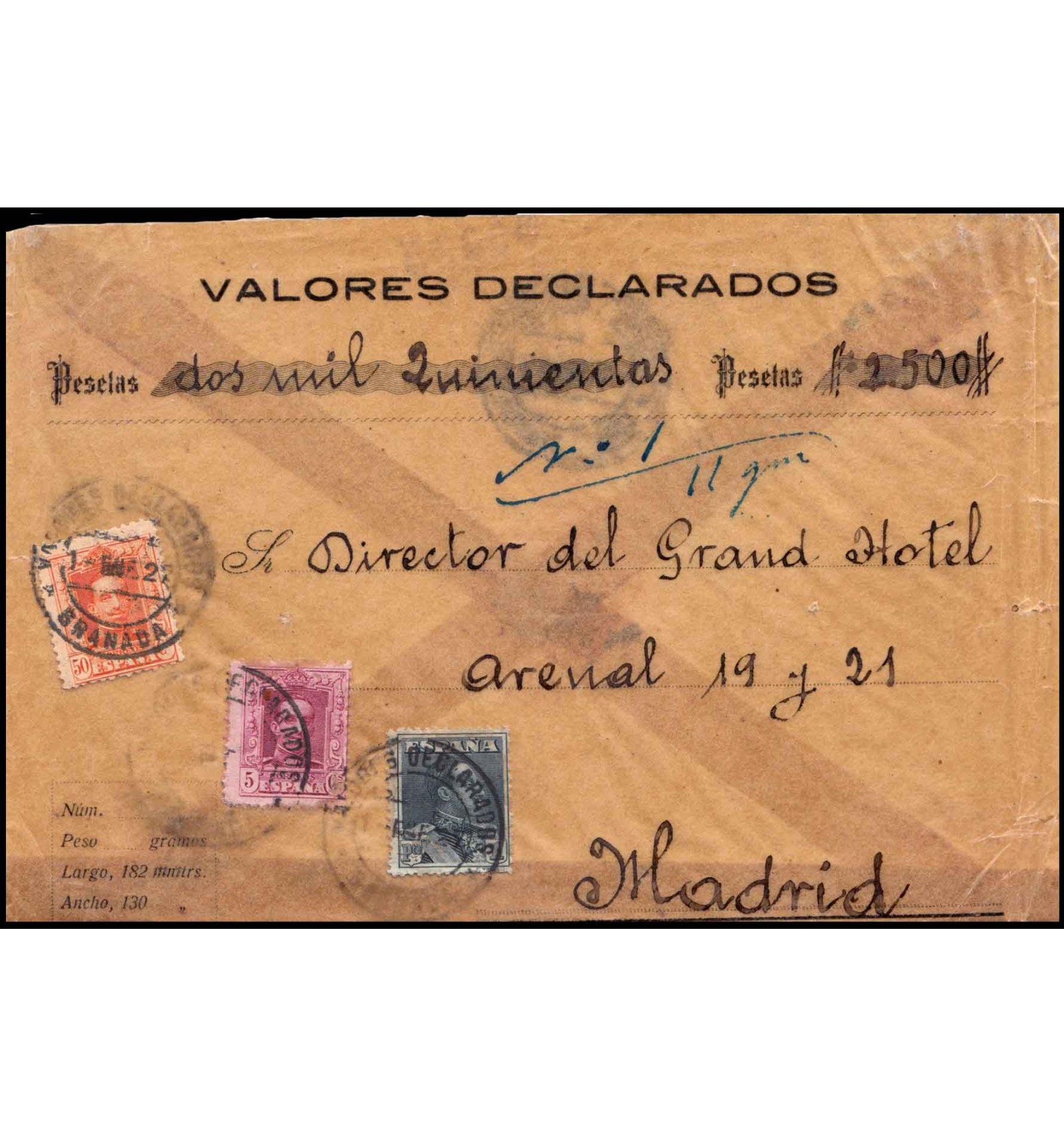 Sobre propio transparente para valores declarados de Granada a Madrid del 1 de enero de 1927. Franqueo correspondiente a un valor declarado de 2.5000 en sobre específico.