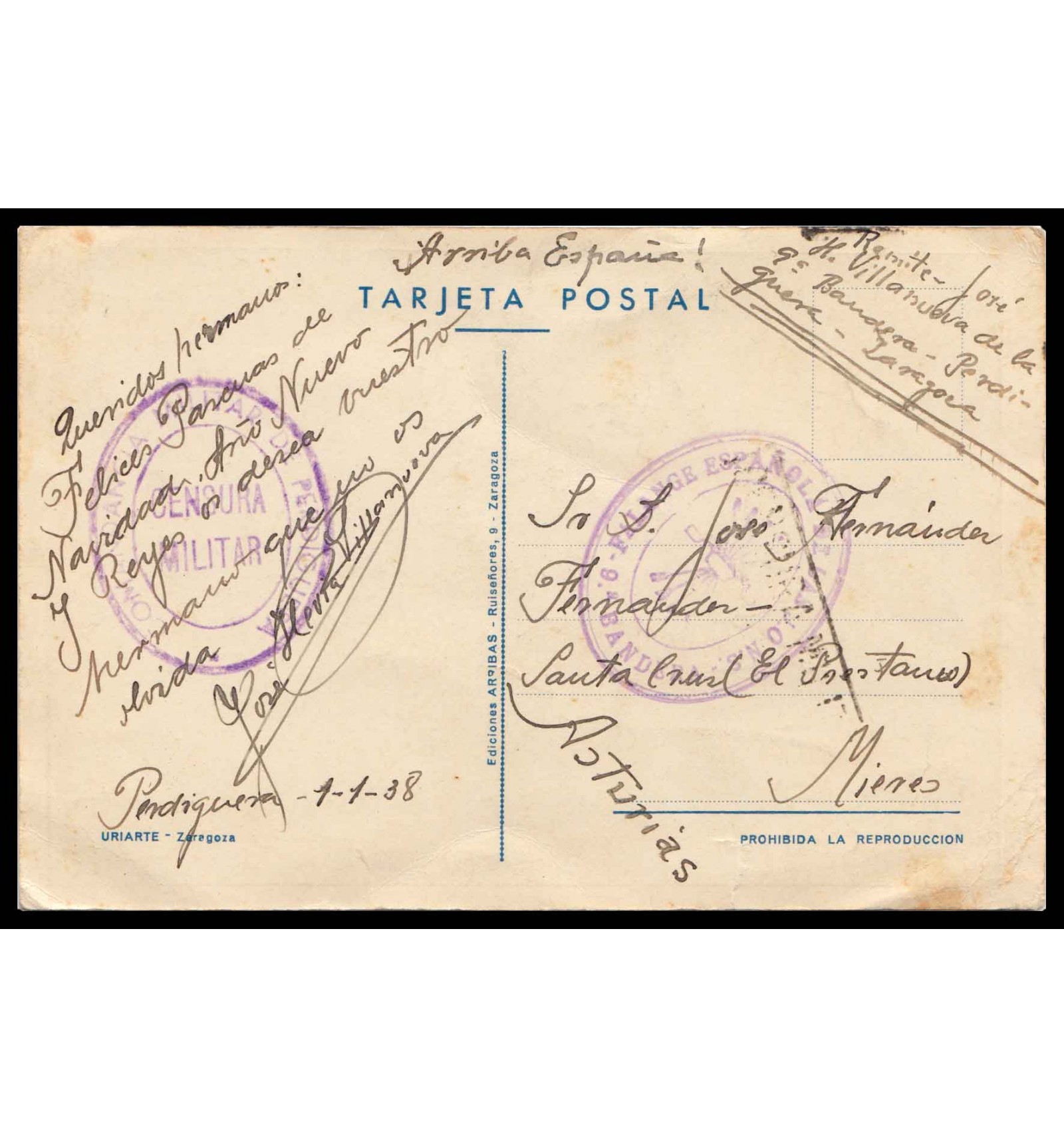 Tarjeta postal de Perdiguera (Zaragoza) a Mieres (Asturias). Circulada con franquicia de 9ª BANDERA FALANGE ESPAÑOLA DE LAS JONS y censura militar de la COMANDANCIA MILITAR DE PERDIGUERA.