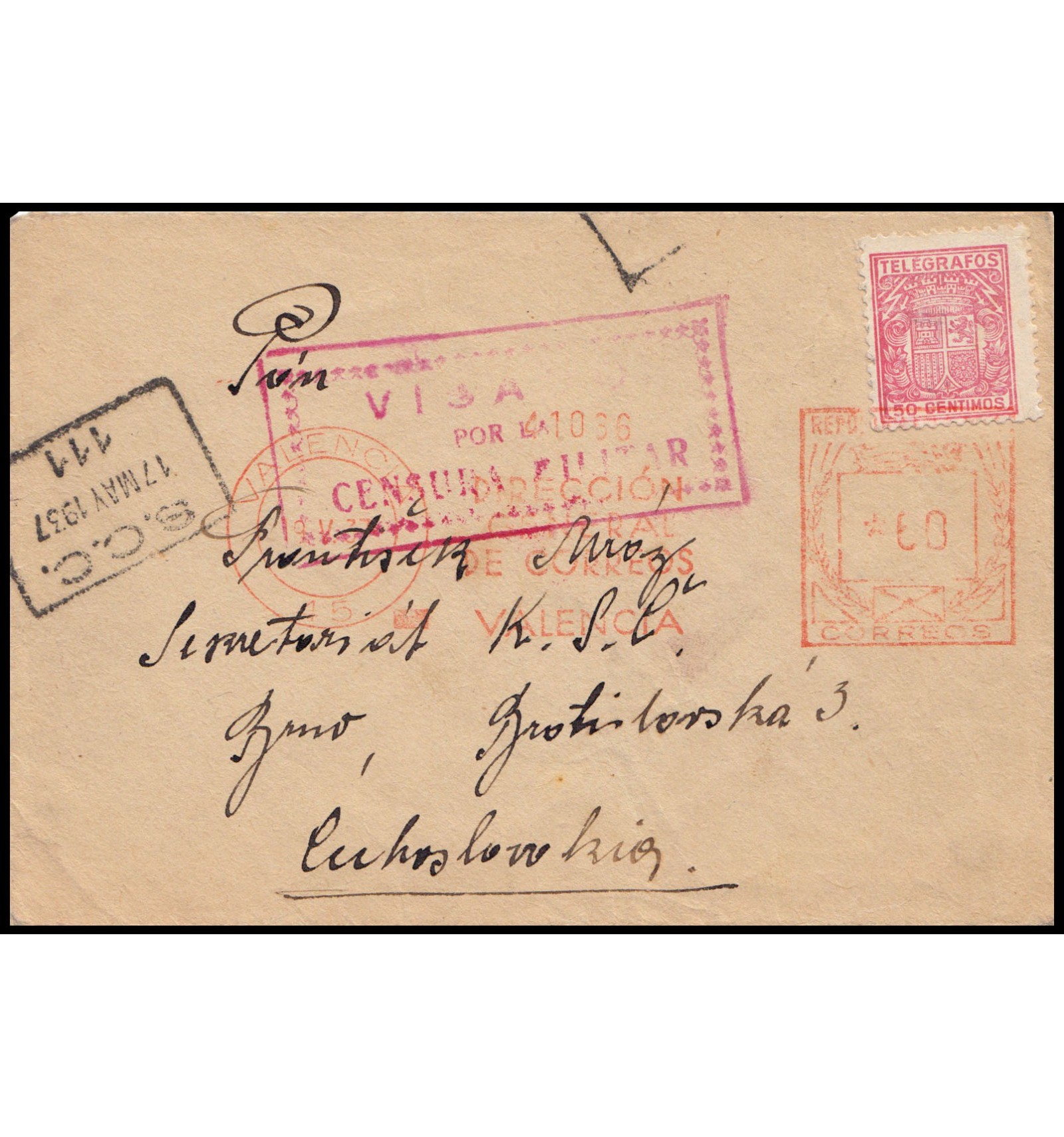 Sobre de Valencia a Brno (República Checa) del 17 de mayo de 1937. Marcas de Brigadas Internacionales SCC 111. Franqueo mecánico de 60 cts y franqueo complementario de 50 cts utilizando sello de telégrafos. Marca rectangular de VISADO POR LA CENSURA MILITAR.