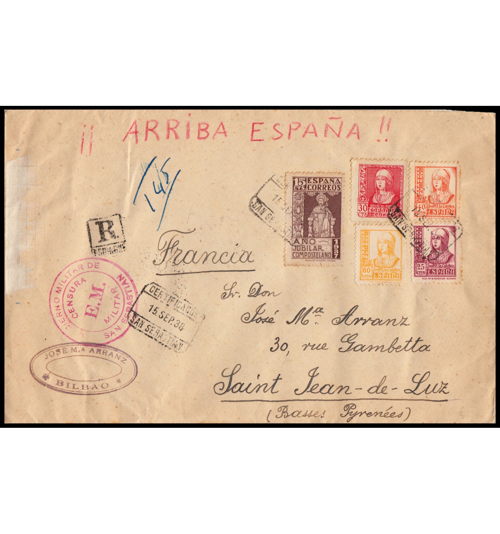 Carta realmente circulada de San Sebastián a San Juan de Luz (Francia) el 15 de septiembre de 1938. Censurada en San Sebastián (en anverso y reverso) y en reverso tránsito por Irún y llegada en Francia. En reverso viñetas nacionales de Bilbao, impuestas en reverso como era obligatorio y anuladas con tampón VIVA ESPAÑA. Franqueo correcto de 1,4 ptas (0,7 certificado y 0,7 un porte extranjero).