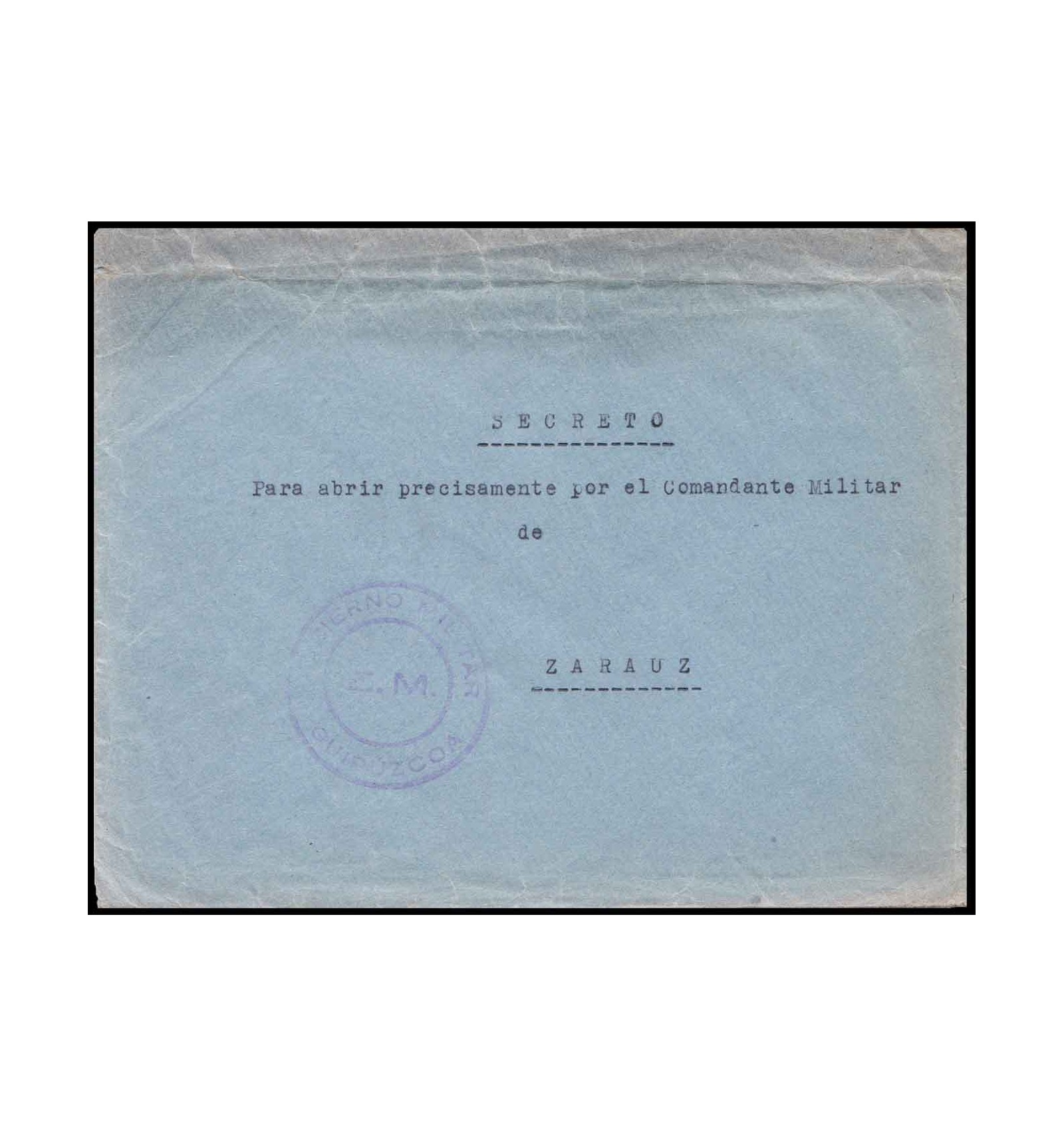 Sobre a Zarauz (Guipúzcoa) con franquicia del Gobierno Militar E.M. Indicación de SECRETO para abrir precisamente por el Comandante Militar de Zarauz. Posiblemente la carta, debido a la información contenida, fuera tramitada en mano por un correo militar específico.