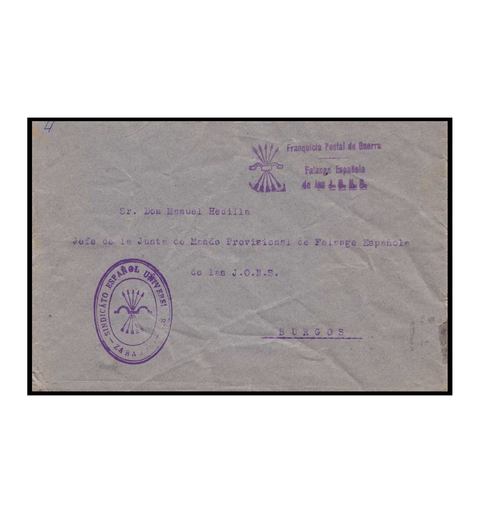 Sobre de Zaragoza a Burgos con llegada el 4 de octubre de 1936 en reverso. Franquicia Postal de Guerra, Falange Española de la JONS y Sindicato Español Universitario. En reverso rodillo de BURGOS CIUDAD ARTISTICA Y MONUMENTAL ESTACION VERANIEGA DE PRIMER ORDEN.