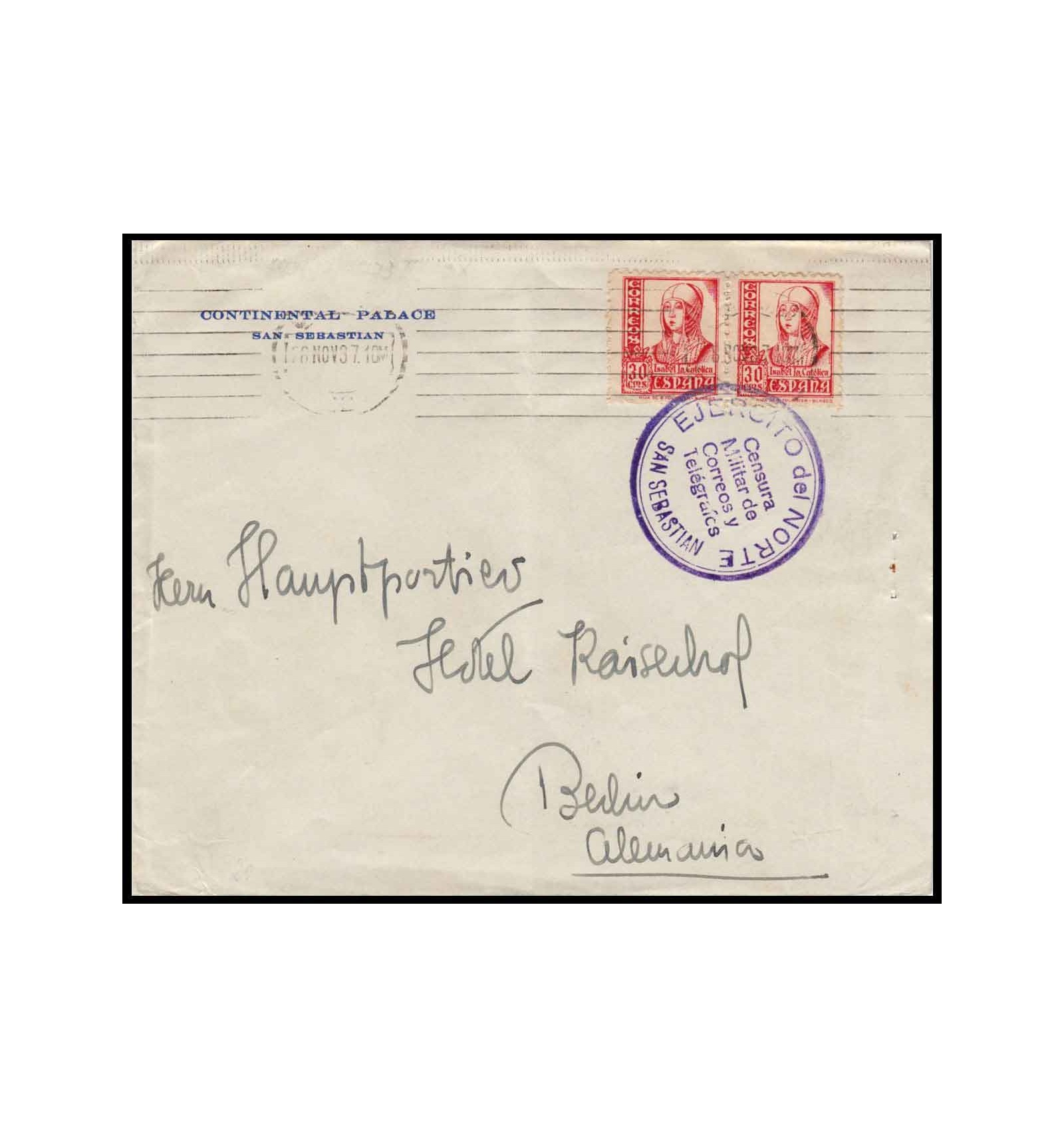 Sobre de San Sebastián (Guipúzcoa) a Alemania del 28 de noviembre de 1938. Marca de censura militar del Ejército del Norte.