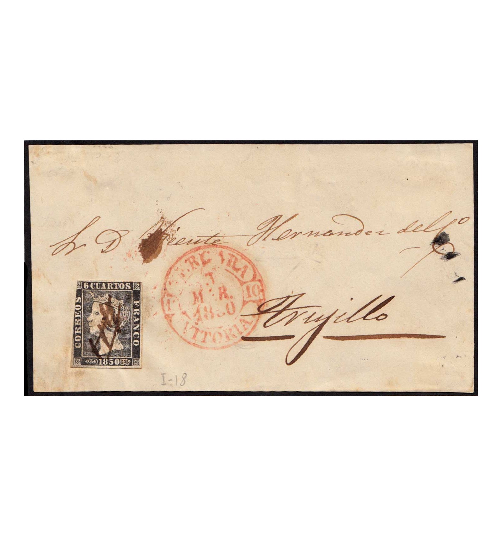 Frontal de Vergara (Guipúzcoa) a Trujillo del 3 de marzo de 1850. Matasello aspa en tinta de escribir y en anverso baeza rojo de Vergara, perteneciente en dicha fecha a la demarcación de Vitoria.