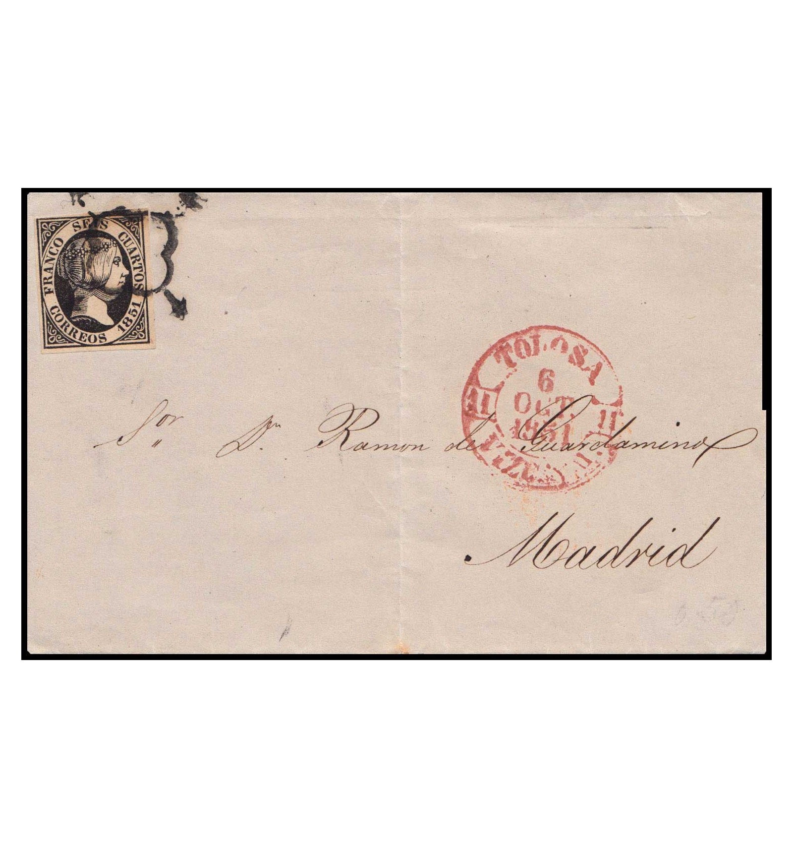 Envuelta de Tolosa (Guipúzcoa) a Madrid del 6 de octubre de 1851. En reverso llegada a Madrid con baeza de 1851 de Madrid.