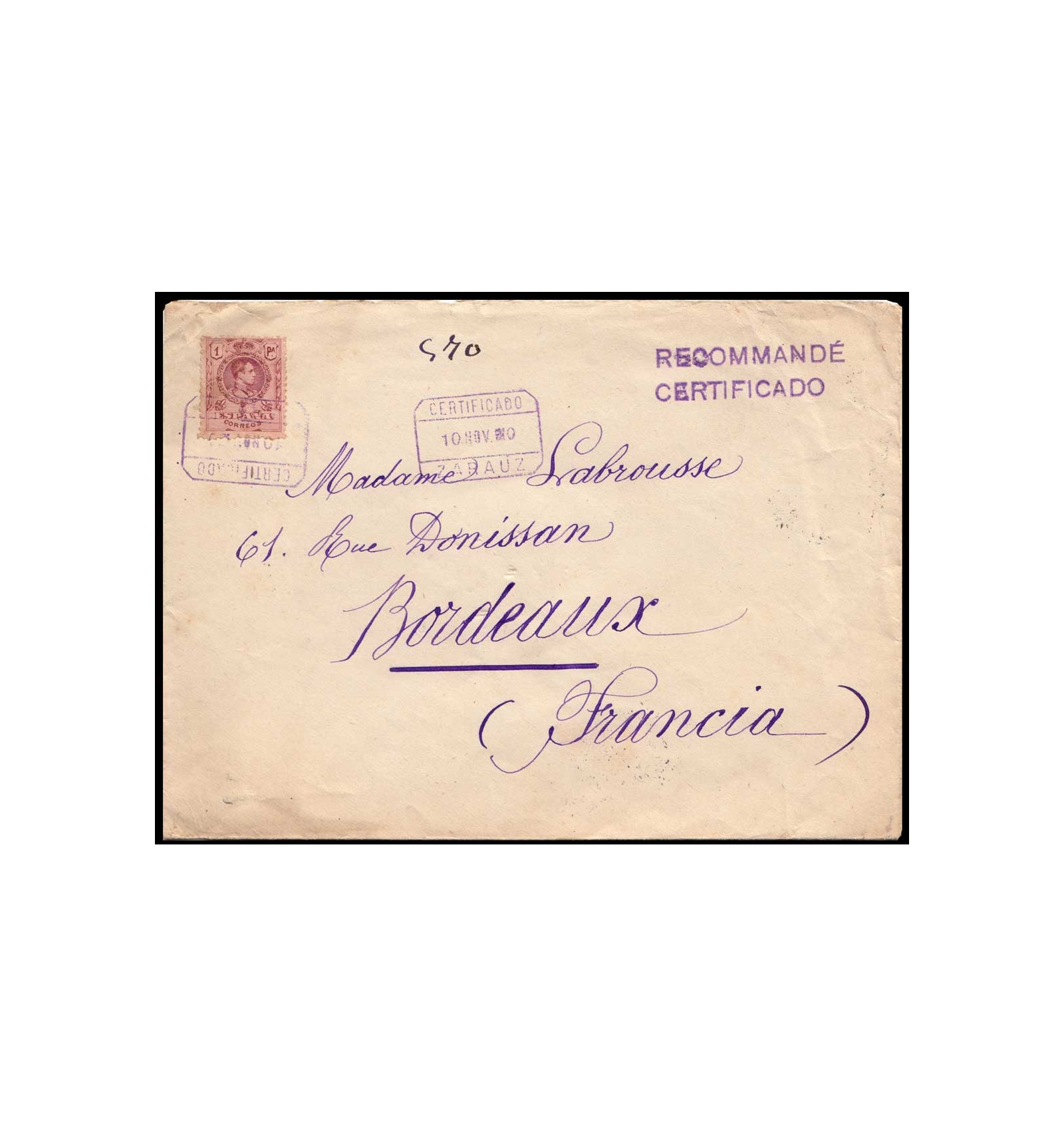 Sobre de Zarauz (Guipúzcoa) a Paris del 10 de noviembre de 1922. Fechador de Zarauz con error en el año y en color azul. Doble porte certificado para tarifa extranjera. En reverso Ambulante descendente de Bilbao-San Sebastián del día 11, certificado del 11 de San Sebastián y tránsito de Francia, todos ellos del año 1922, por lo que el fechador de Zarauz contiene un error en el año.