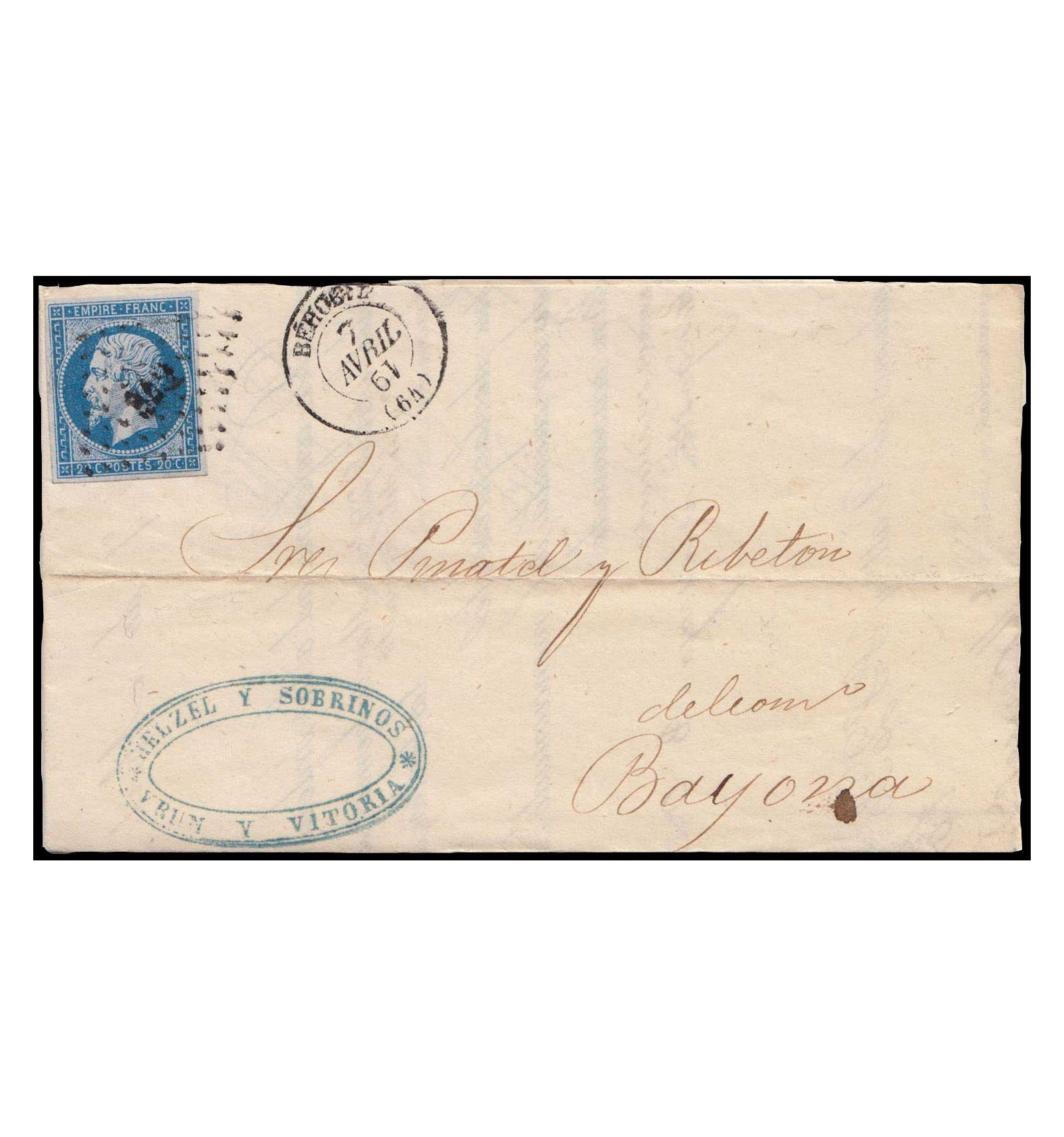 Carta de Irún a Bayona fechada interiormente el 7 de abril de 1861. En vez de depositarse en Irún se pasó a mano hasta Behobia (en la oficina francesa; el fechador del año está invertido) donde se depositó a fin de evitar el pago de la tarifa extranjera a Francia. Son cartas nada frecuentes.