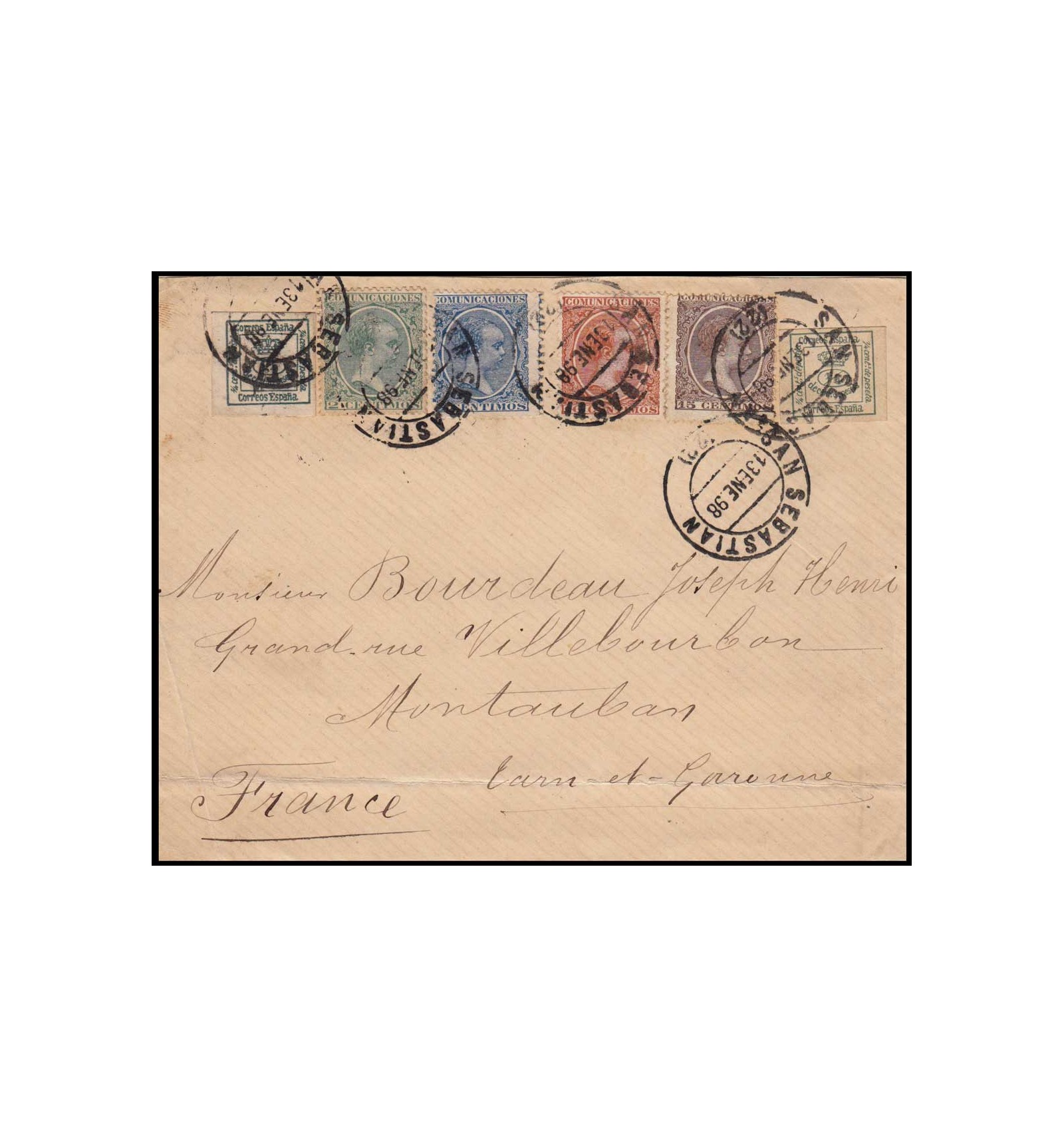 Frontal de San Sebastián (Guipúzcoa) a Francia del 13 de enero de 1898. Rara composición de franqueo multicolor de 35 cts realizada con 5 sellos diferentes que no llegamos a comprender.