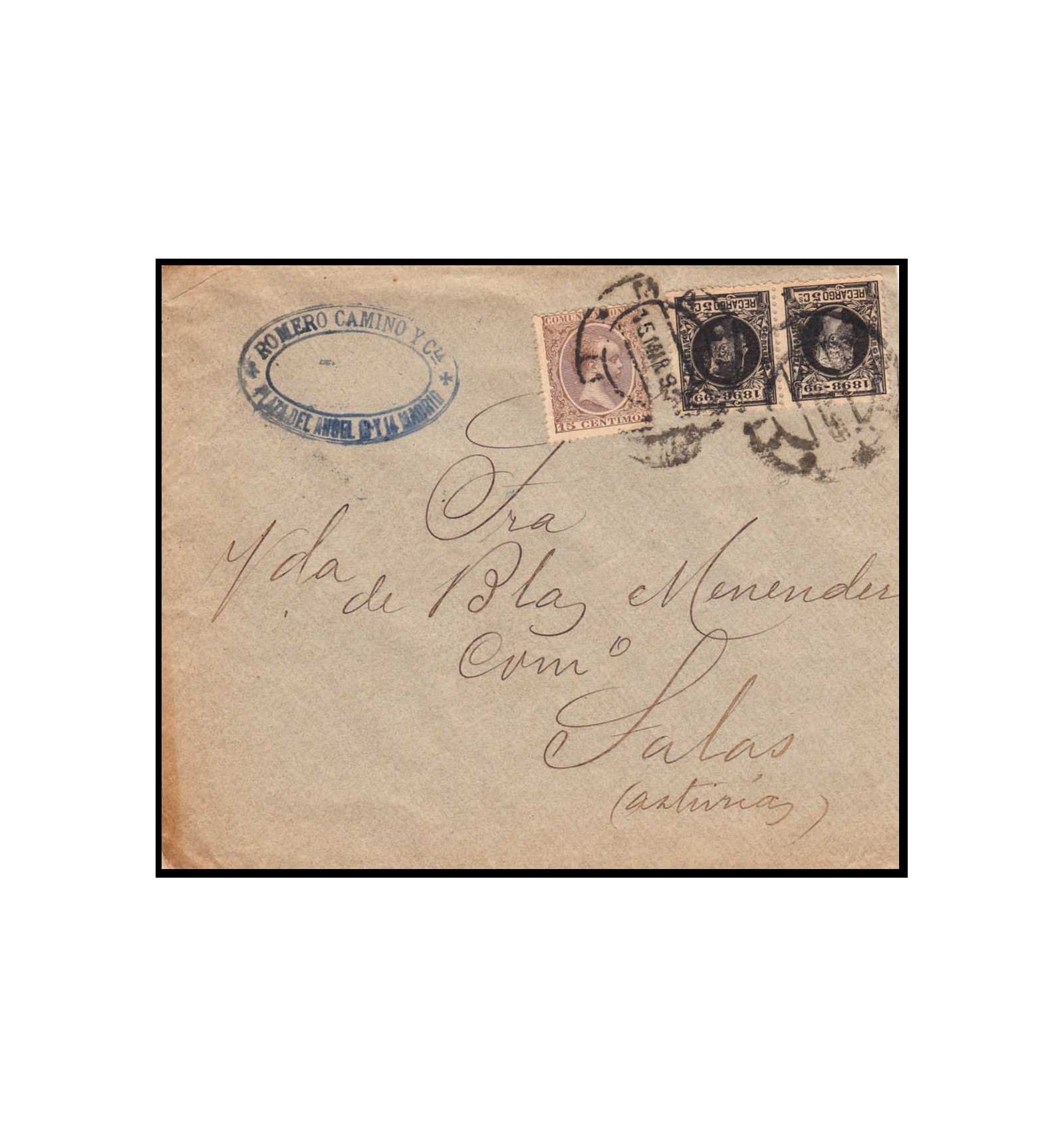 Sobre de Madrid a Salas (Asturias) del 15 de marzo de 1899. Sobre con imposición de doble recargo de guerra o impuesto de guerra, siendo solo necesario un sello de 5 cts y no dos (10 cts).