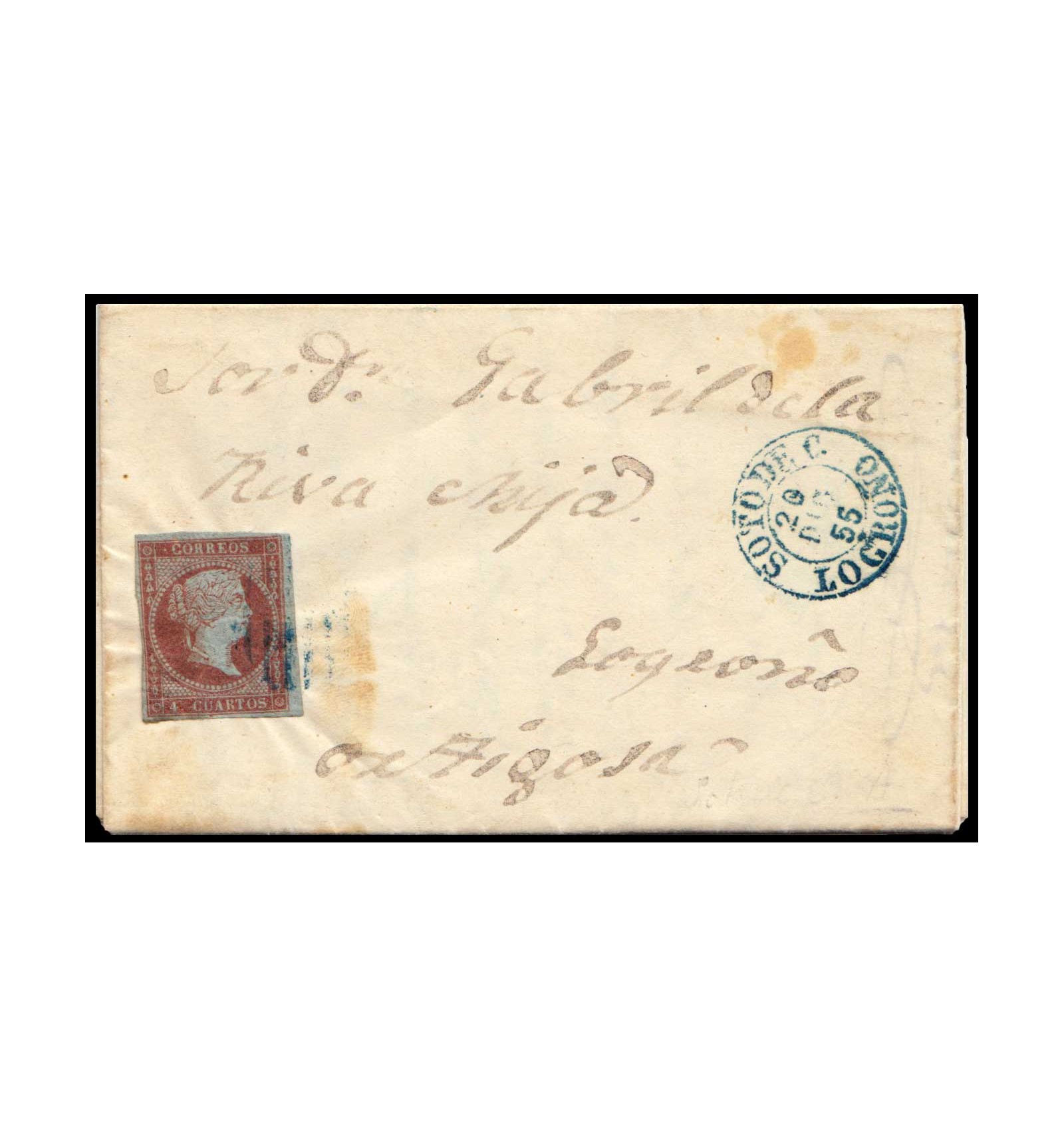 Carta de Laguna de Cameros (Logroño, La Rioja) a Ortigosa del 20 de diciembre de 1855. Parrilla azul y fechador azul de Soto de Cameros.
