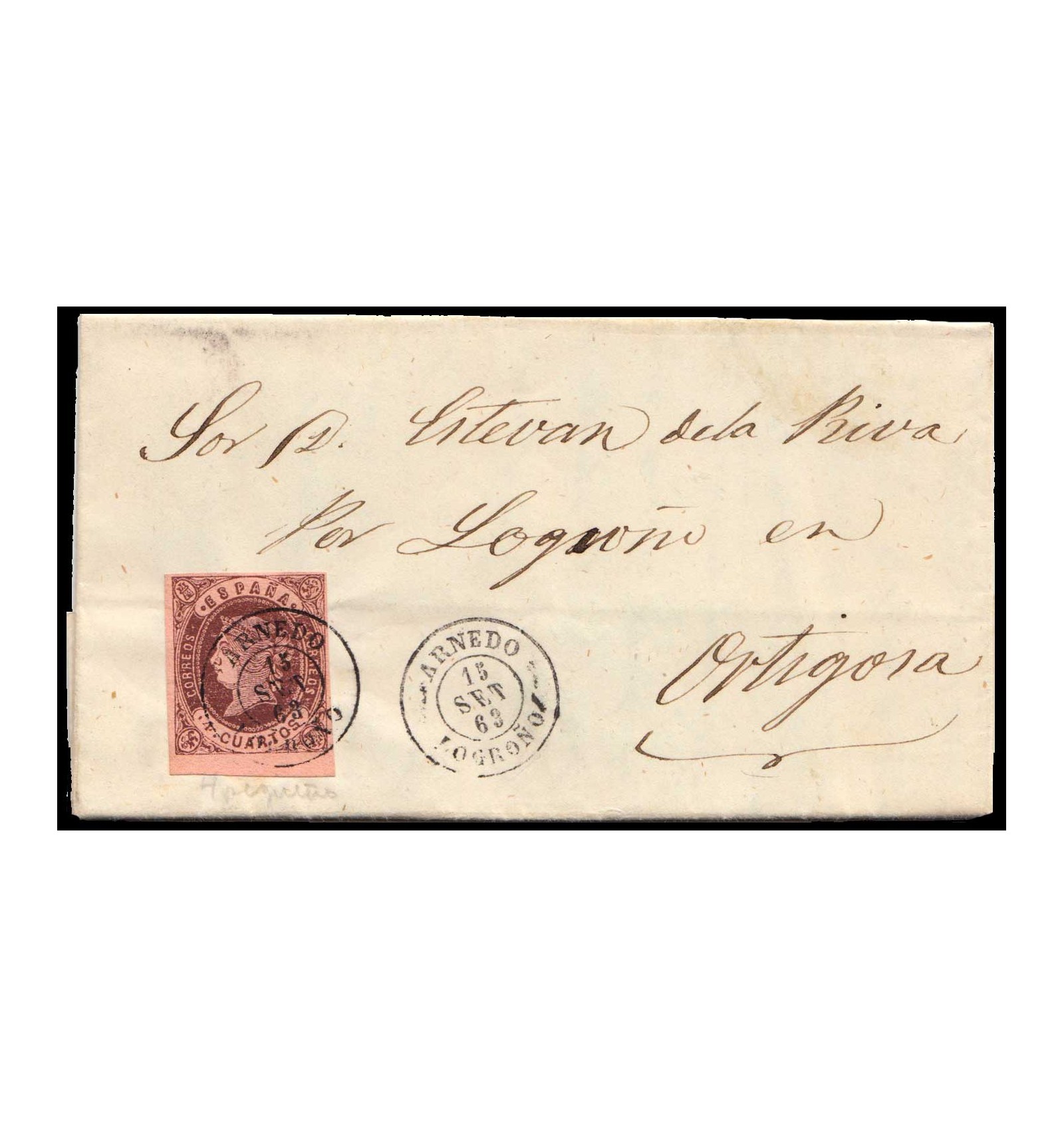 Carta de Munilla (Logroño, La Rioja) a Ortigosa del 13 de septiembre de 1863. Fechador negro de Arnedo.