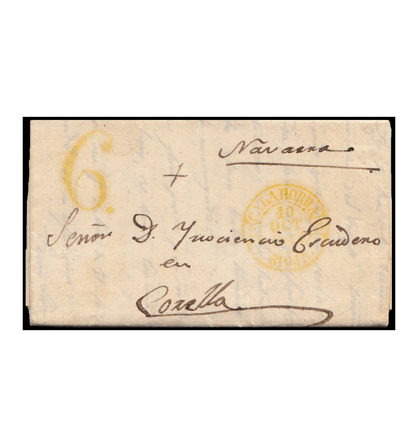Carta de Arnedo (La Rioja) a Corella (Navarra) del 10 de octubree 1844. Baeza amarillo de Calahorra. Porteo 6 amarillo.