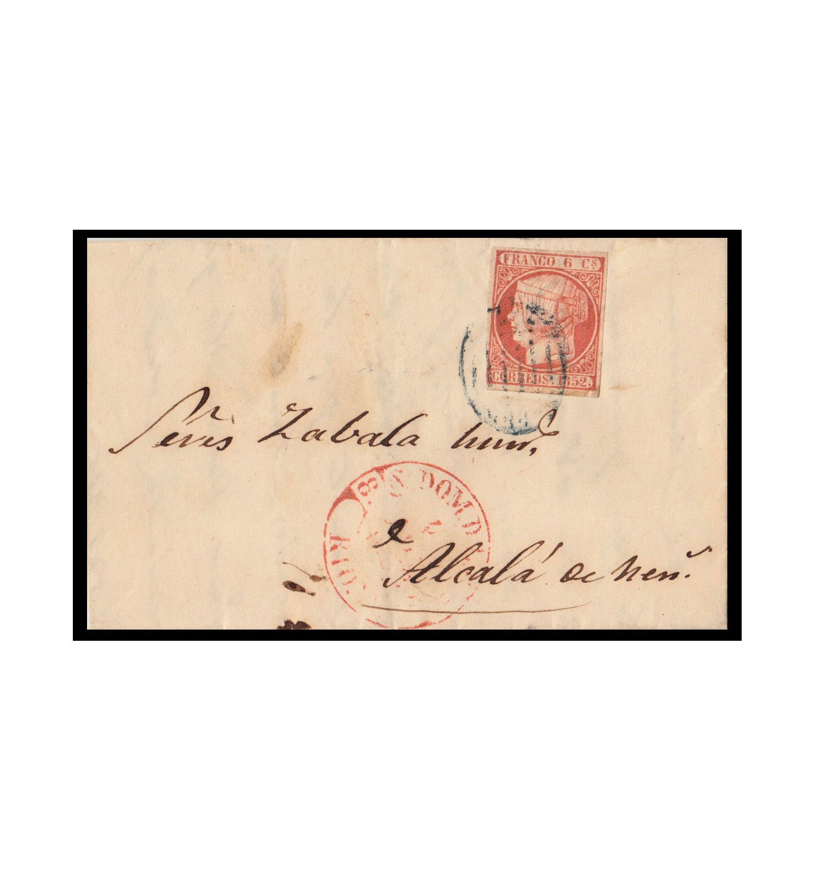 Carta de Ezcaray (Rioja) a Alcalá de Henares del 4 de agosto de 1852. Sello anulado con parrilla azul y en anverso baeza de Santo Domingo de la Calzada.