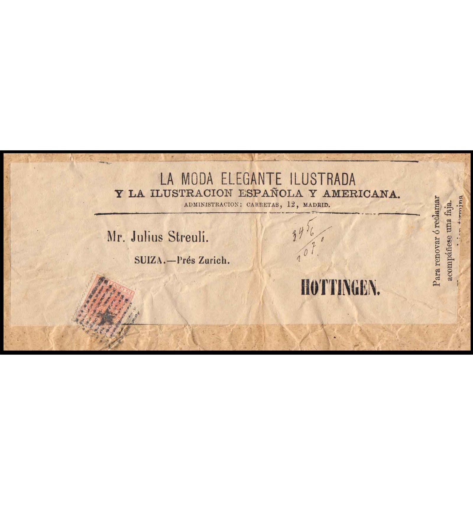 Frontal de faja de periódicos de Madrid a Hottingen (Suiza) de entre 1882 a 1889. Franqueo de tres portes (entre 101 y 150 gramos).