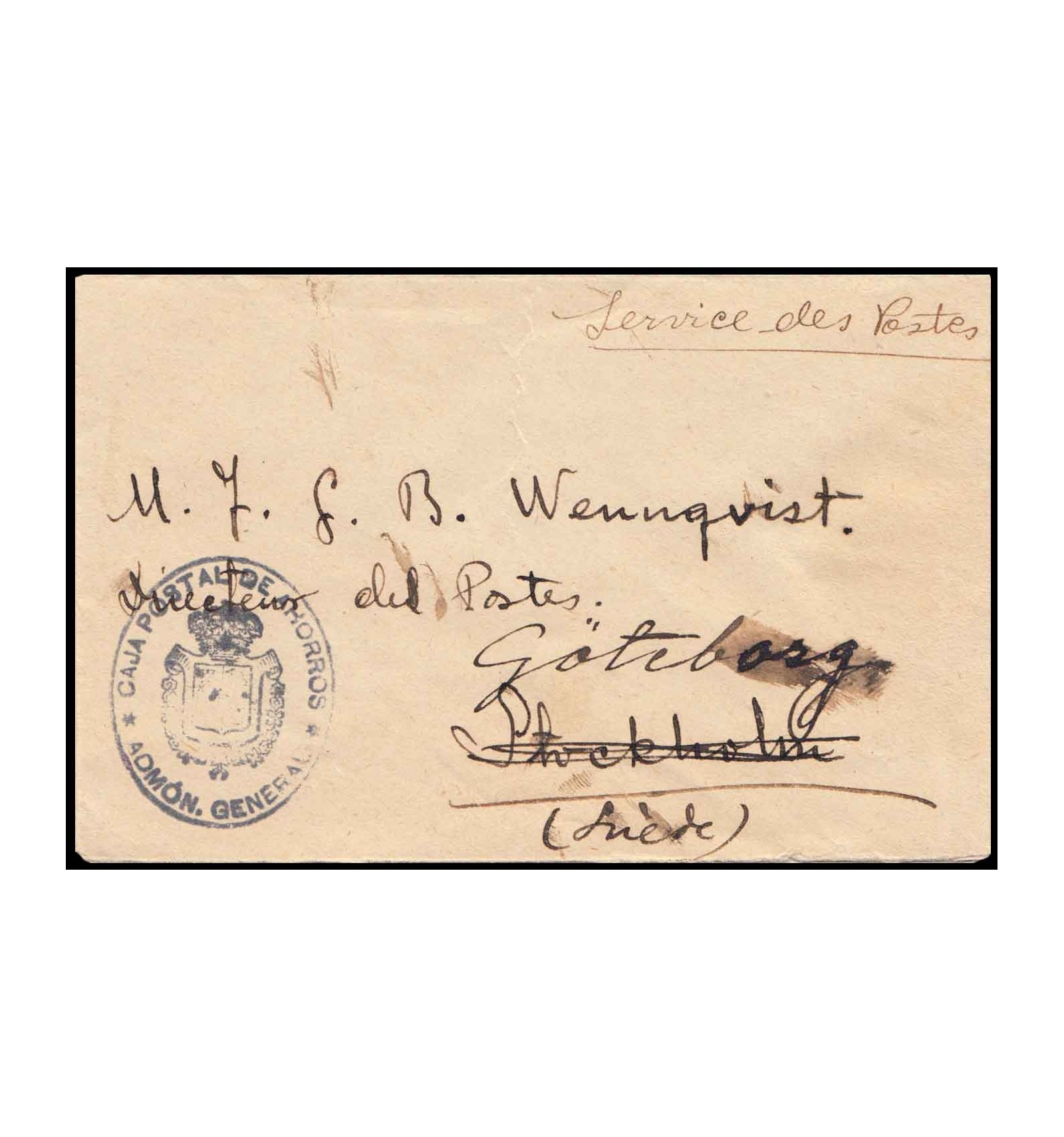 Sobre de Madrid a Suecia (reexpedida internamente) de enero de 1925. Franquicia a destino extranjero de la Administración General de la Caja Postal de Ahorros. En reverso llegada a Estocolmo.
