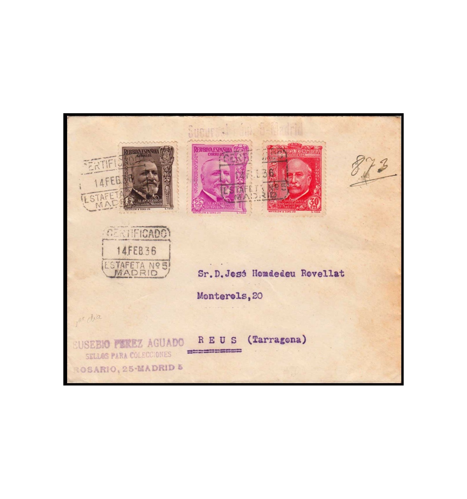 Carta de certificado de Madrid a Reus del 14 de febrero de 1936 (primer día de circulación). Matasello de Madrid Estafeta nº 5.