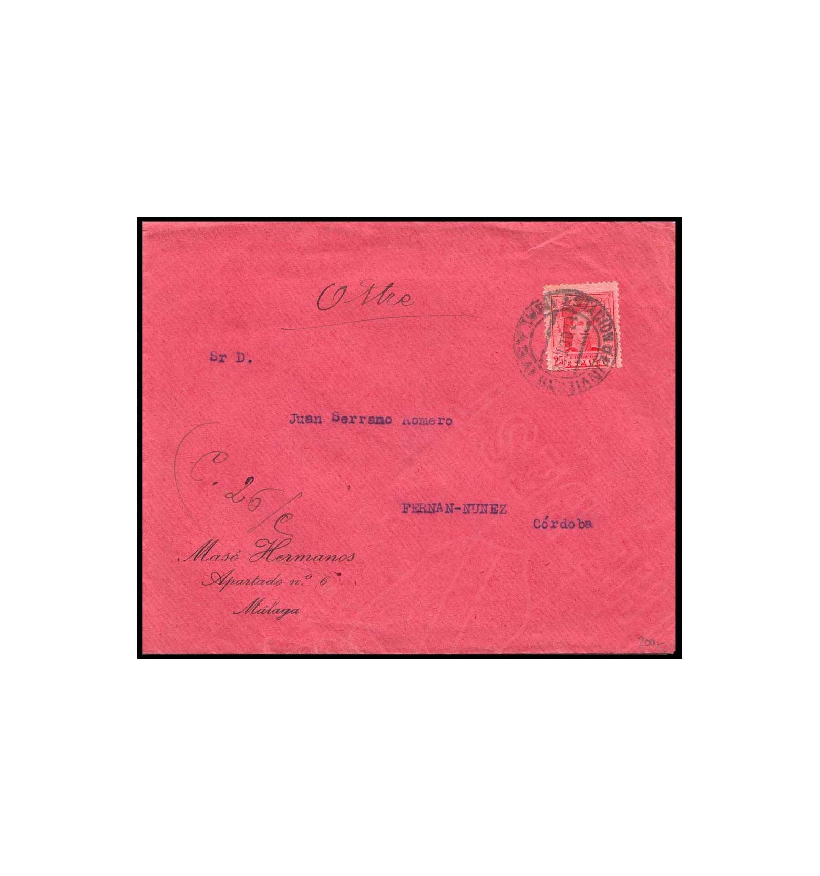 Sobre de Málaga a Córdoba del 17 de octubre de 1928. Matasello Estación de Invierno.